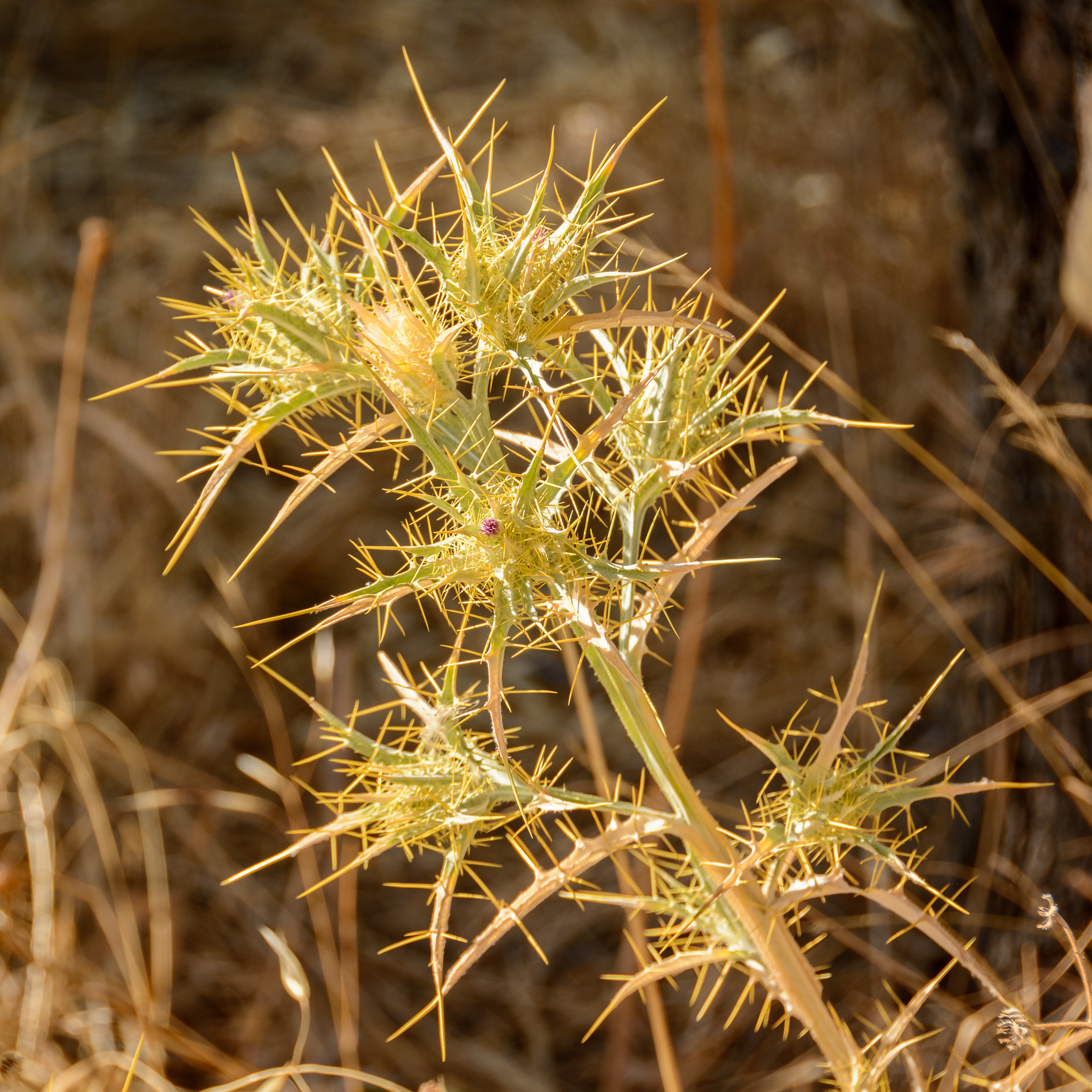 Snyggt taget på den taggiga växten. Fint ljus och fin liten lila blomma (?)