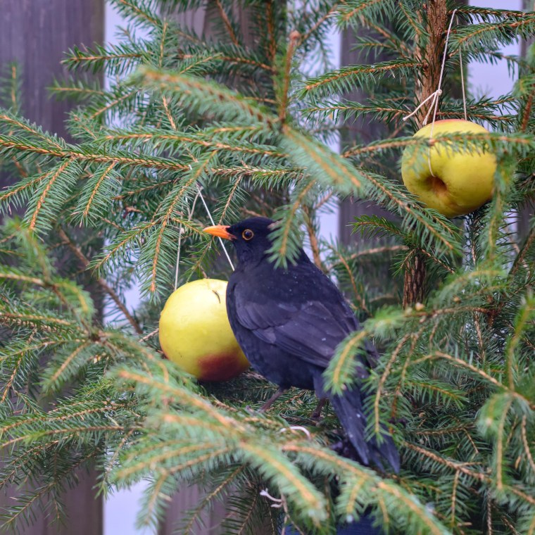 Före jul satte vi en liten gran i en kruka på balkongen och hängde dit äpplen som prydnad (numera uppätna och ersatta av nya). Sedan en tid tillbaka har vi dagliga besök av koltrastar, som verkligen gillar äpplen. Här har jag fångat en av dem ”mitt i maten”.