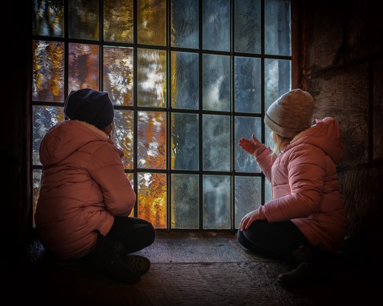 Helheten tilltalar mig. Färgen i vänstra delen av fönstret återspeglas i barnens kläder. Ett rofyllt foto.