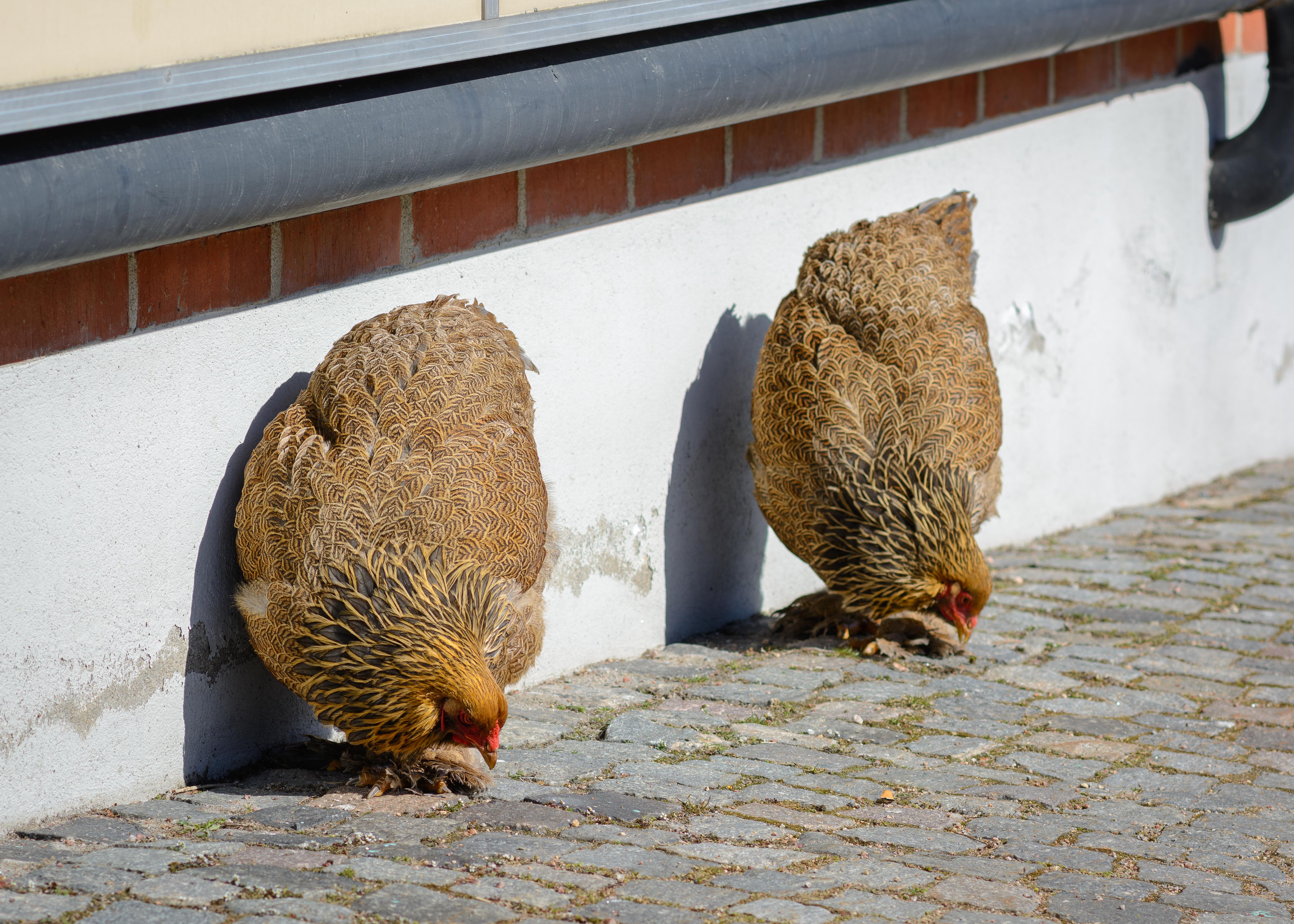 I ett kvarter här i närheten ligger hotell Edgar. Sedan hösten 2017 har de även en liten hönsgård med värphönsen Pizza och Peperoni. De tar sig ofta en promenad på gatorna i närheten och här tycks de ha hittat någonting på marken 🙂