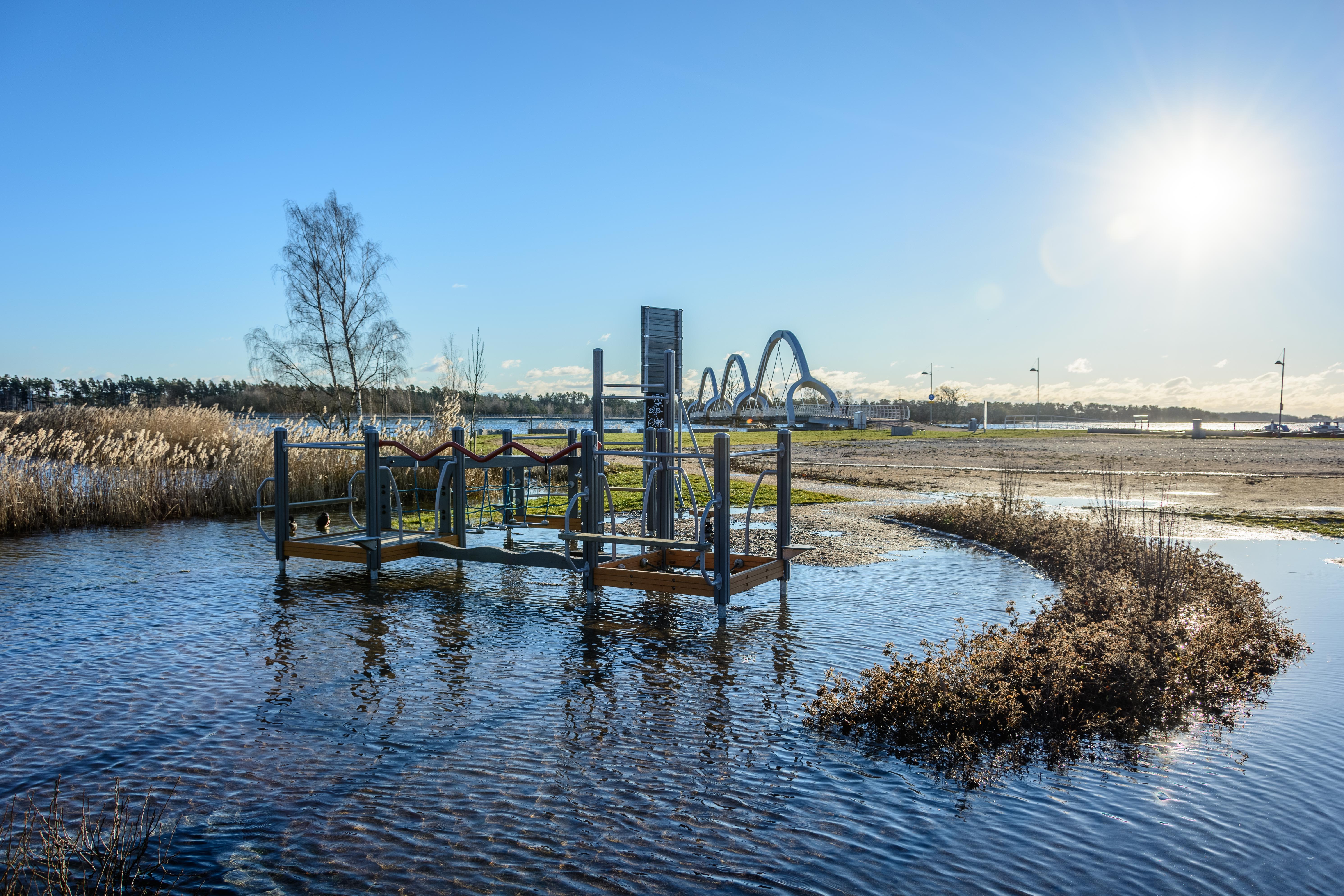 Igår var det lågvatten och en bra bit under medelvattennivå. Idag har det varit översvämningar pga extremt hög vattennivå. Mer än en meter över medelvattennivån, så skillnaden mot igår är väldigt stor. De kraftiga vindarna från stormen Alfrida måste ha pressat in rejält med vatten i viken under natten.