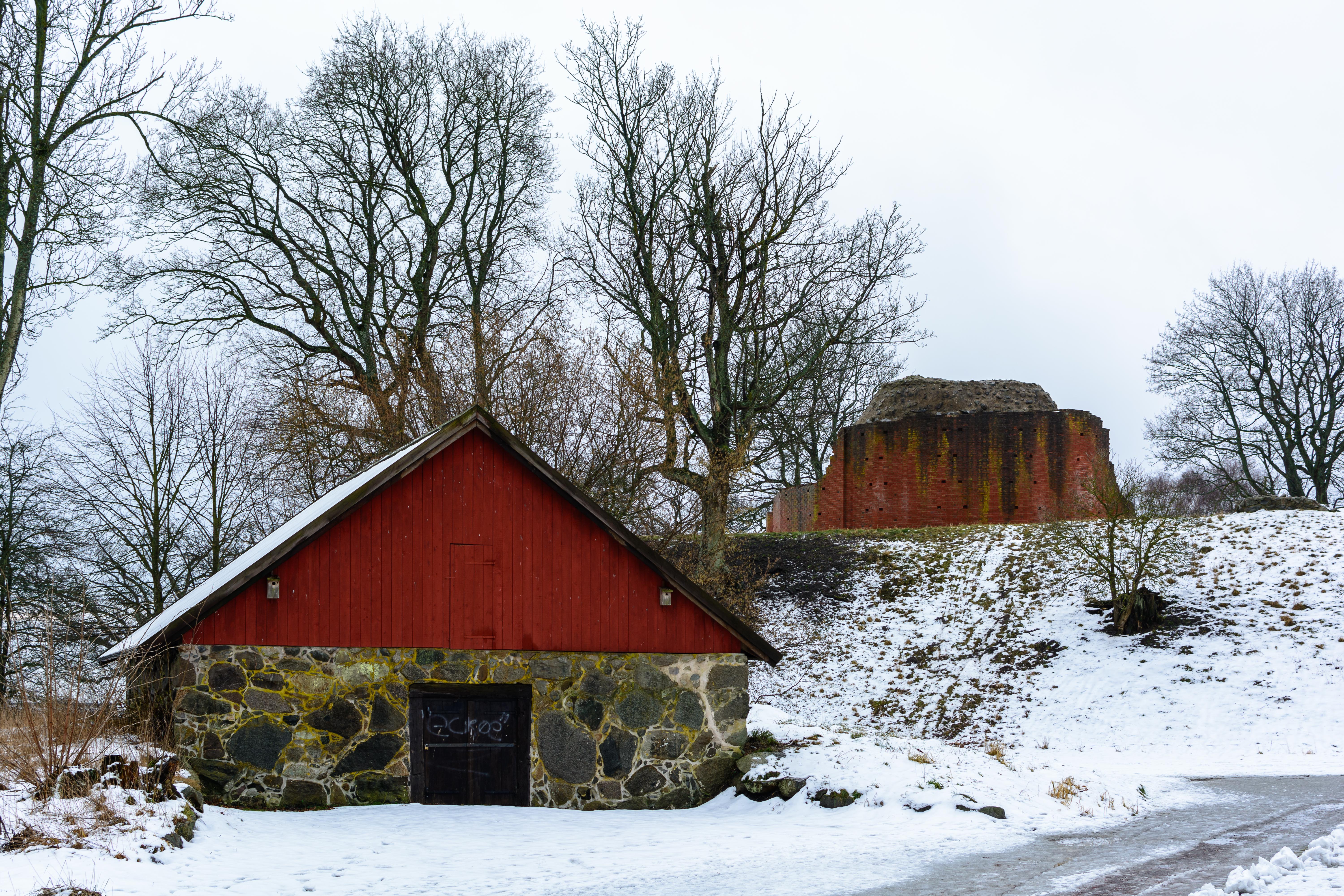 Härligt motiv – det röda står sig fint mot det vintervita och särskilt som ruinen eller vad det är i bakgrunden tar upp det röda igen! Snyggt!