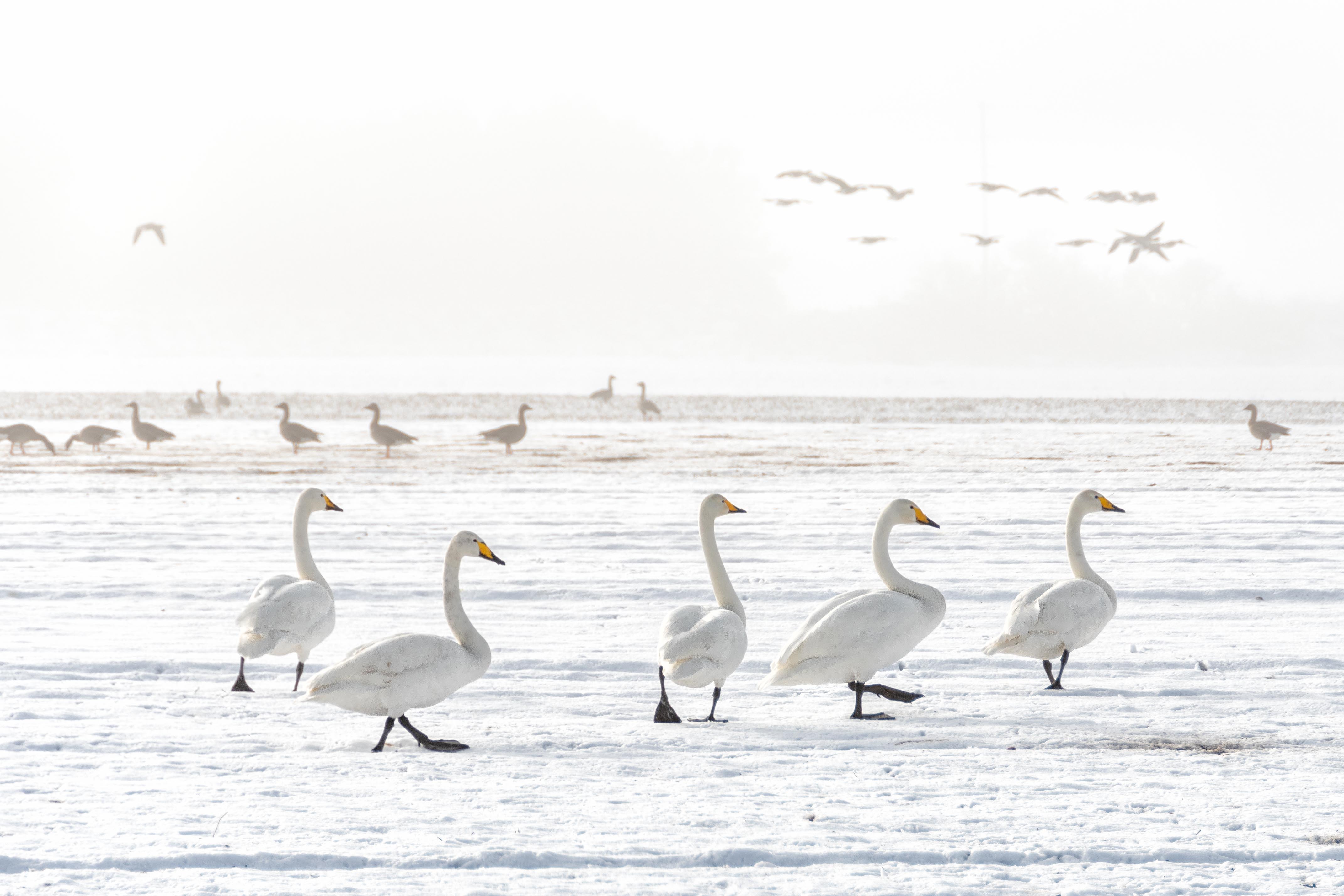Jättefin tolkning av temat. Härligt djup i bilden. Fint att fåglarna i bakgrunden är lite soft uttonade, gråa liksom. Svanarna vandrar bestämt åt samma håll med häftigt utstickande färgfläckar på näbbarna.