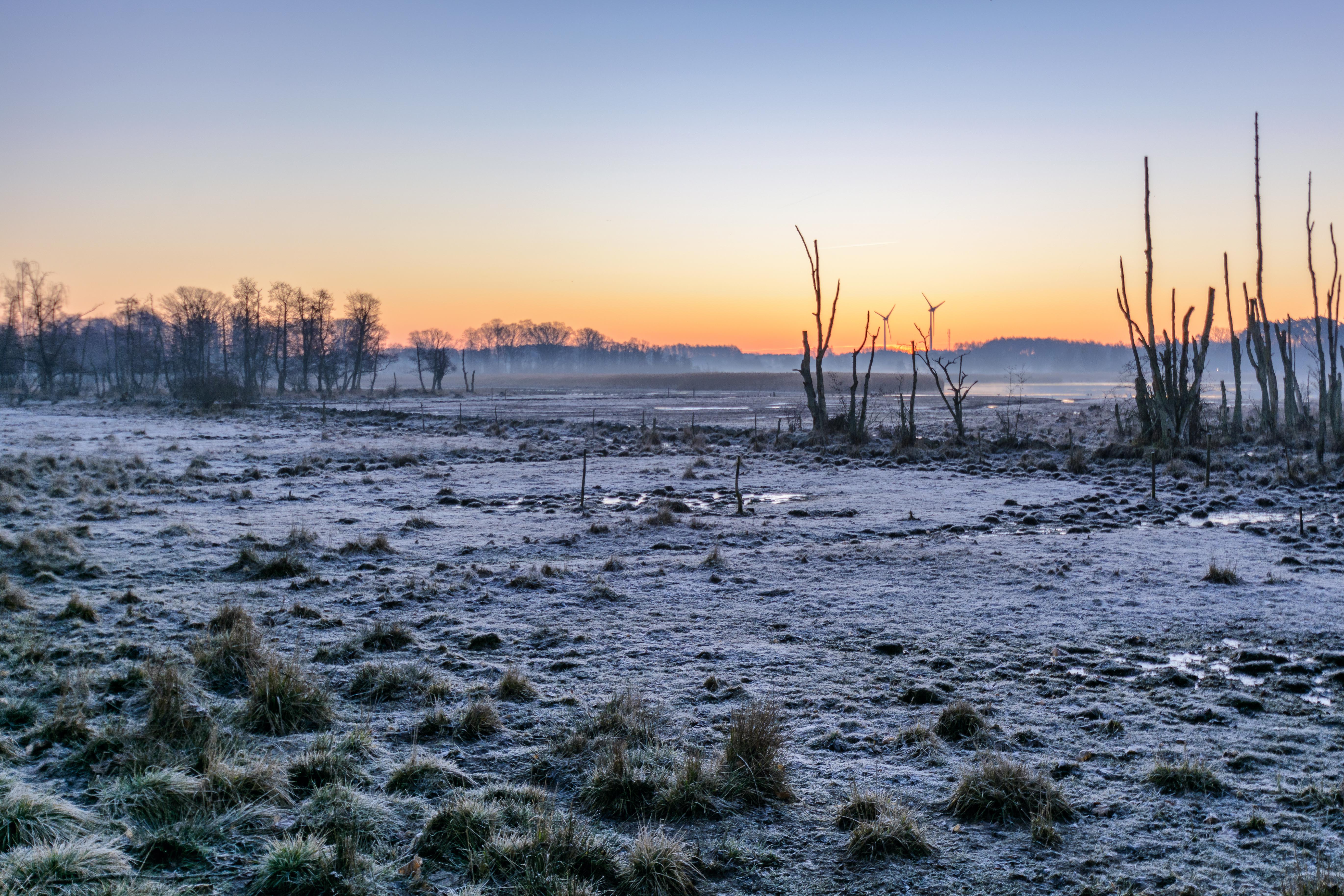 1. Spännande bild! Frostig mark och fint ljus i horisonten. Mitt första intryck när jag såg bilden var att här har det brunnit, kanske för de kala ”pinnarna” som sticker upp och där frosten var kvarliggande aska.