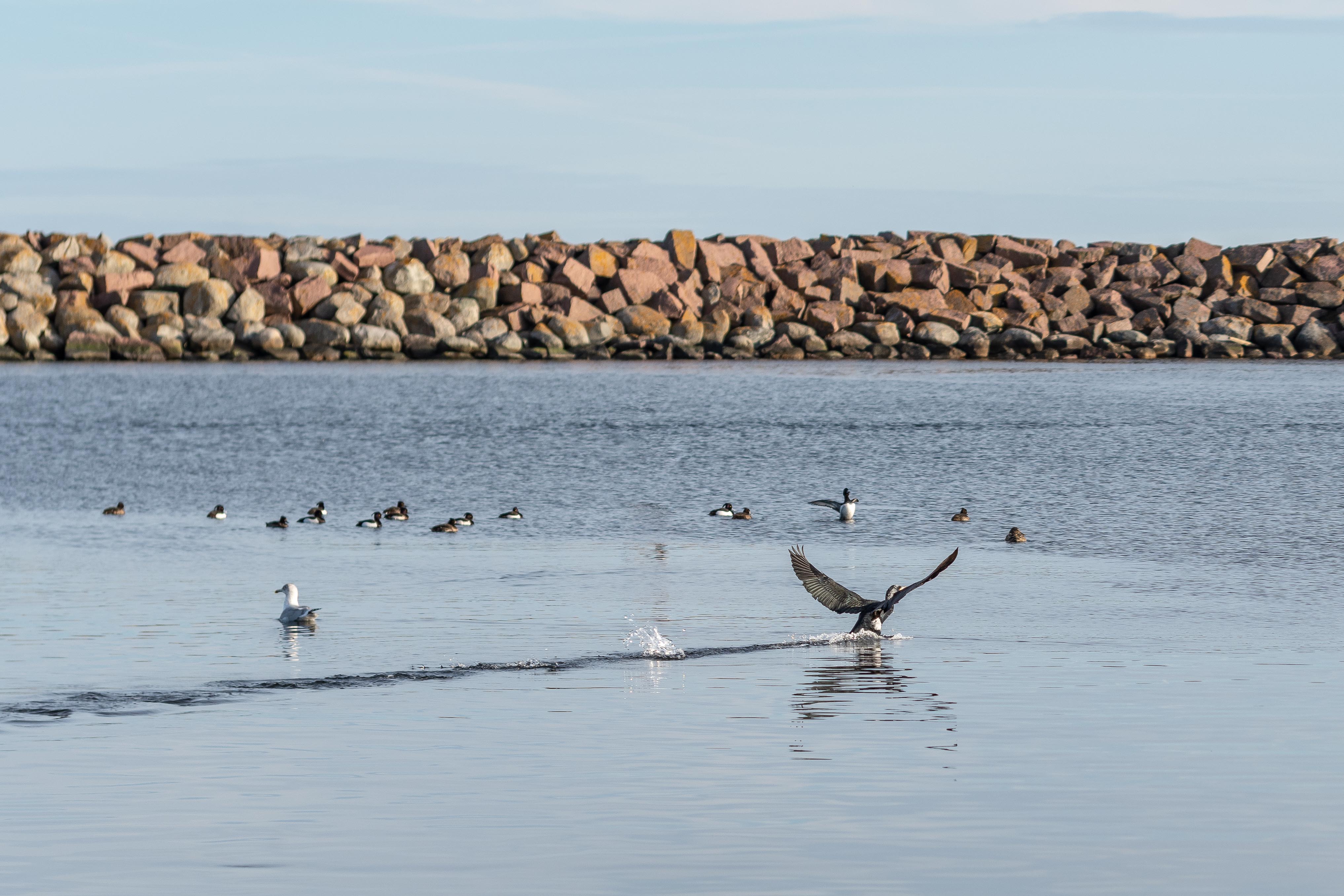 Snyggt att fånga skarven i rörelse med sådan exakt skärpa och spåret i vattnet som visat på temat. Vackert också med ljuset på piren.