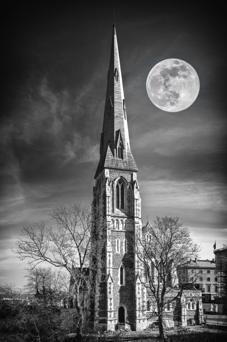 Här är det jag som har varit lite leklysten 🙂 Tänkte jag skulle öva på att lägga ihop två bilder. Kyrkan fotograferade jag i Köpenhamn för någon vecka sedan och fullmånen igår kväll.