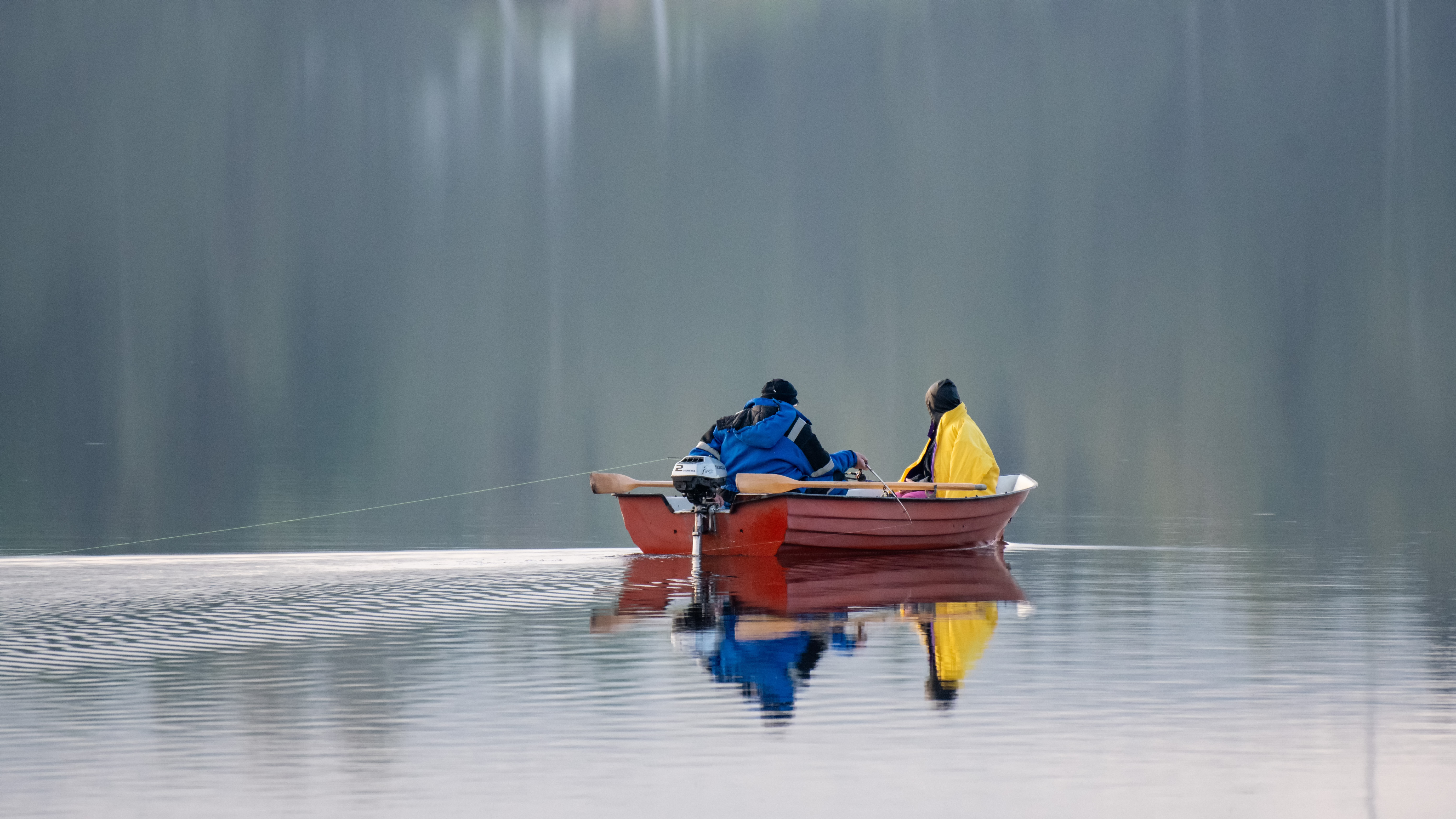 Så häftigt när vattnet och bakgrunden liksom smälter ihop. Snyggt med färgen på båten och fiskarna i kontrast till det grågrönblå.