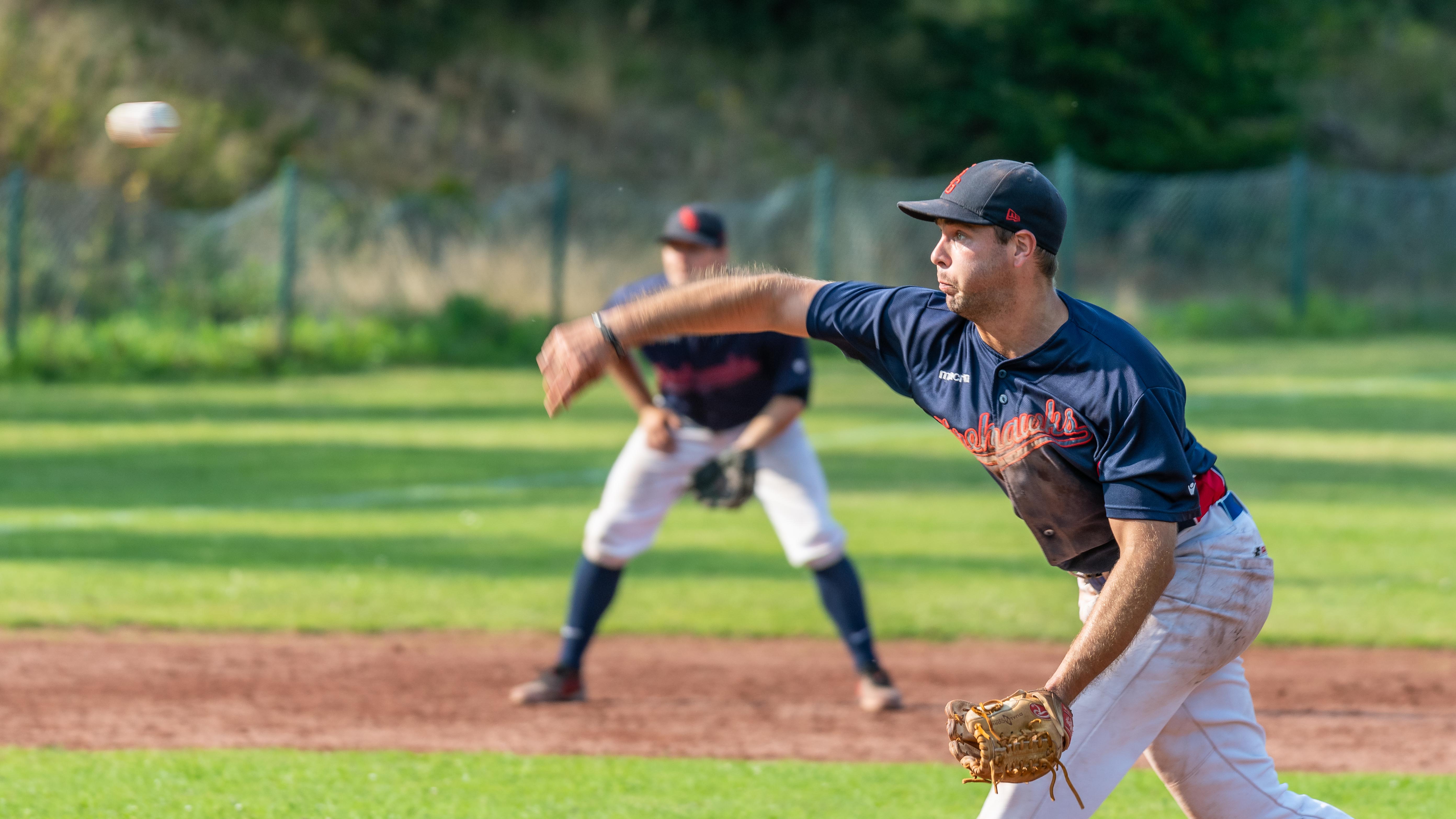 Ett viktigt moment i baseball. Här har kastaren (pitcher) precis kastat bollen mot sin mottagare (catcher).