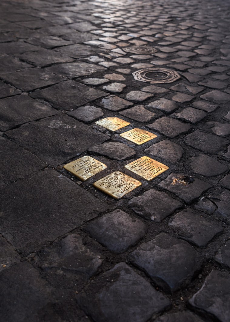 Bilden är tagen i de judiska kvarteren i Rom. Stenarna med ovansida av mässing är s k snubbelstenar, minnesmärken över judar som nazisterna (i just de här fallen) arresterade och deporterade till koncentrationslägret Auschwitz under andra världskriget. Det finns totalt ca 70.000 sådana stenar på olika platser i Europa. Du kan läsa mer här.