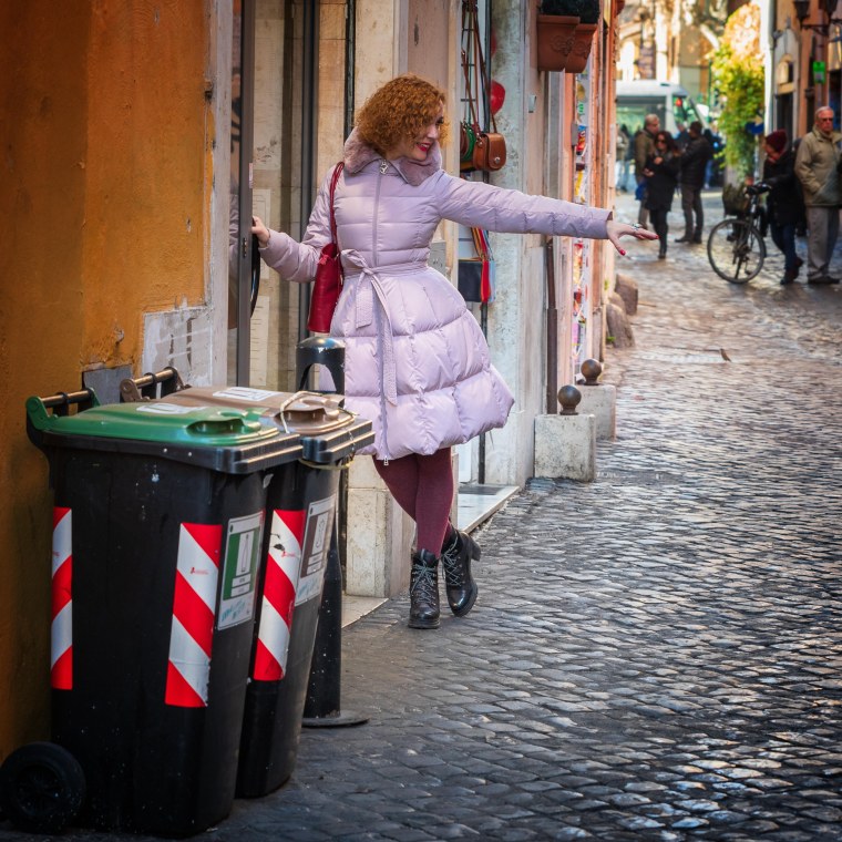 Kul bild, ser ut som om hon poserar men inte för dig. Färgen på jackan passar bra till temat. Snyggt att man ser lite av folklivet, synd bara att soptunnorna står där.