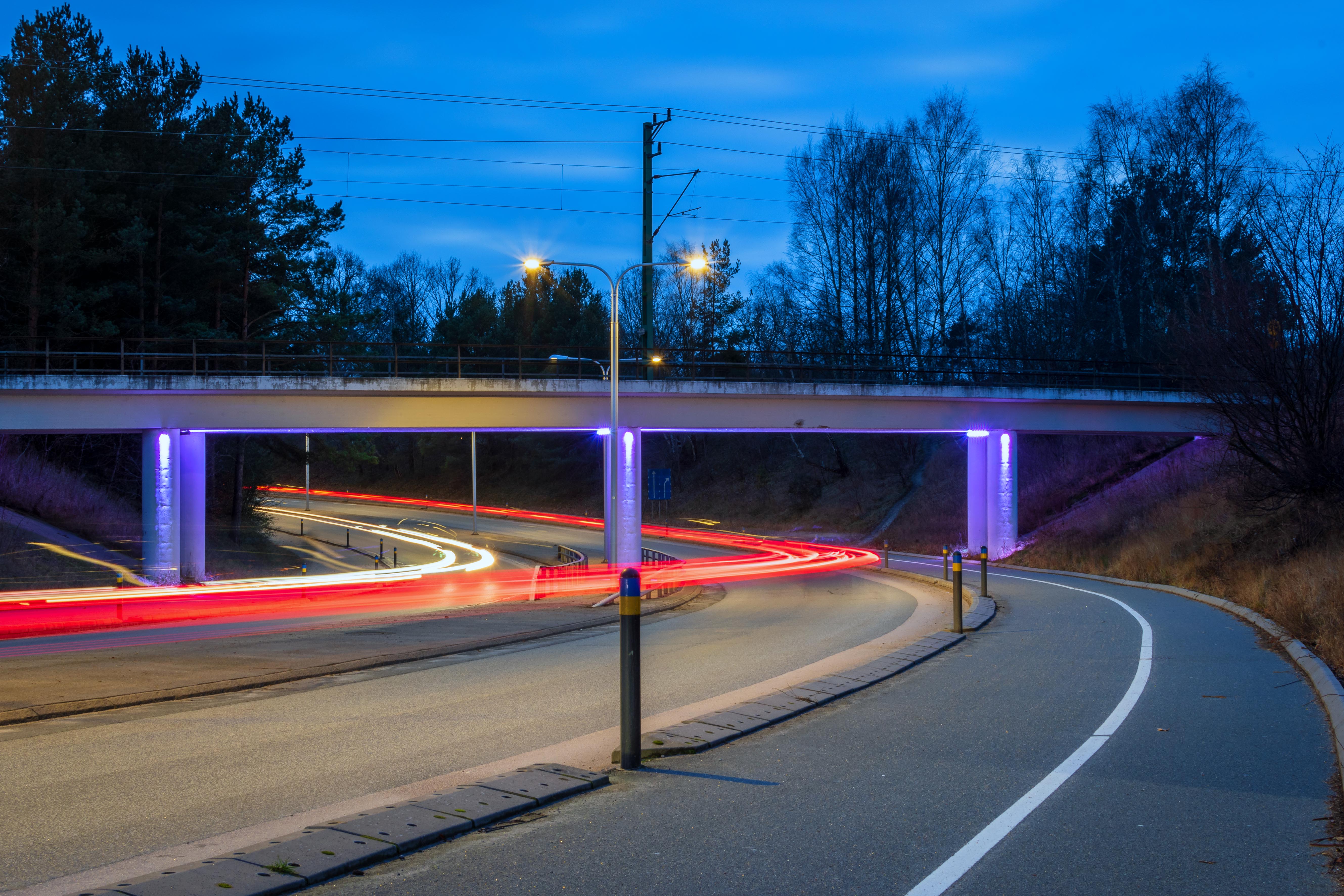 Åh, det är kul att fotografera på kvällen med långa slutartider! Och ett härligt sätt att göra bilden av viadukten intressantare. Gillar verkligen det röda spåret av lyktor!