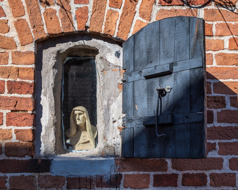 Tegel och trä, flagat murbruk och en fönsterlucka i gammal stil plus en figur som lite längtansfullt tittar ut genom det smala fönstret. En bild helt i min smak 🙂 Skuggan gör sitt och jag vet faktiskt inte om bilden hade blivit bättre om den inte fanns där.