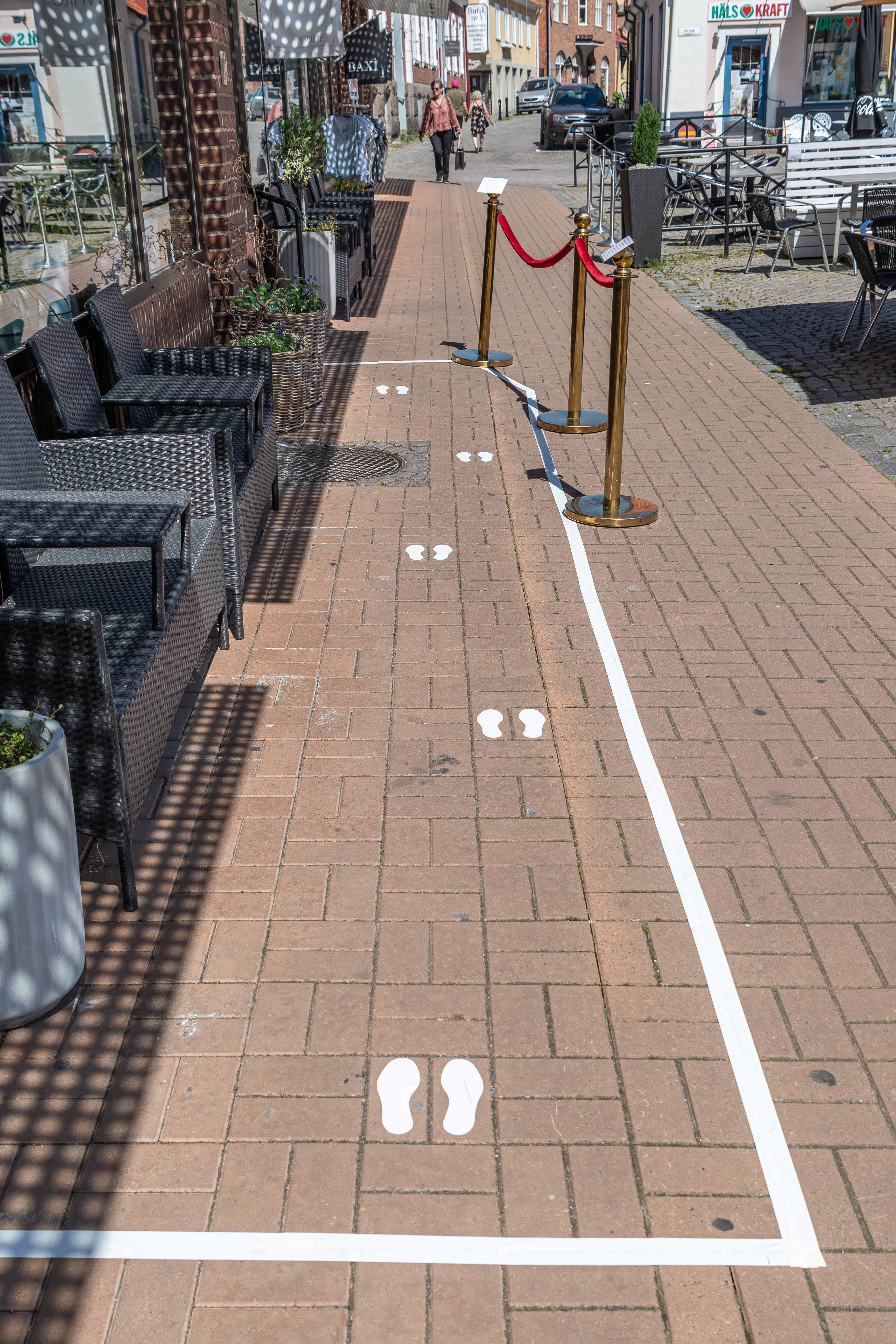 Nu i Coronatider: markering som hjälper oss att hålla avståndet, när vi köar till café Ritz 🙂