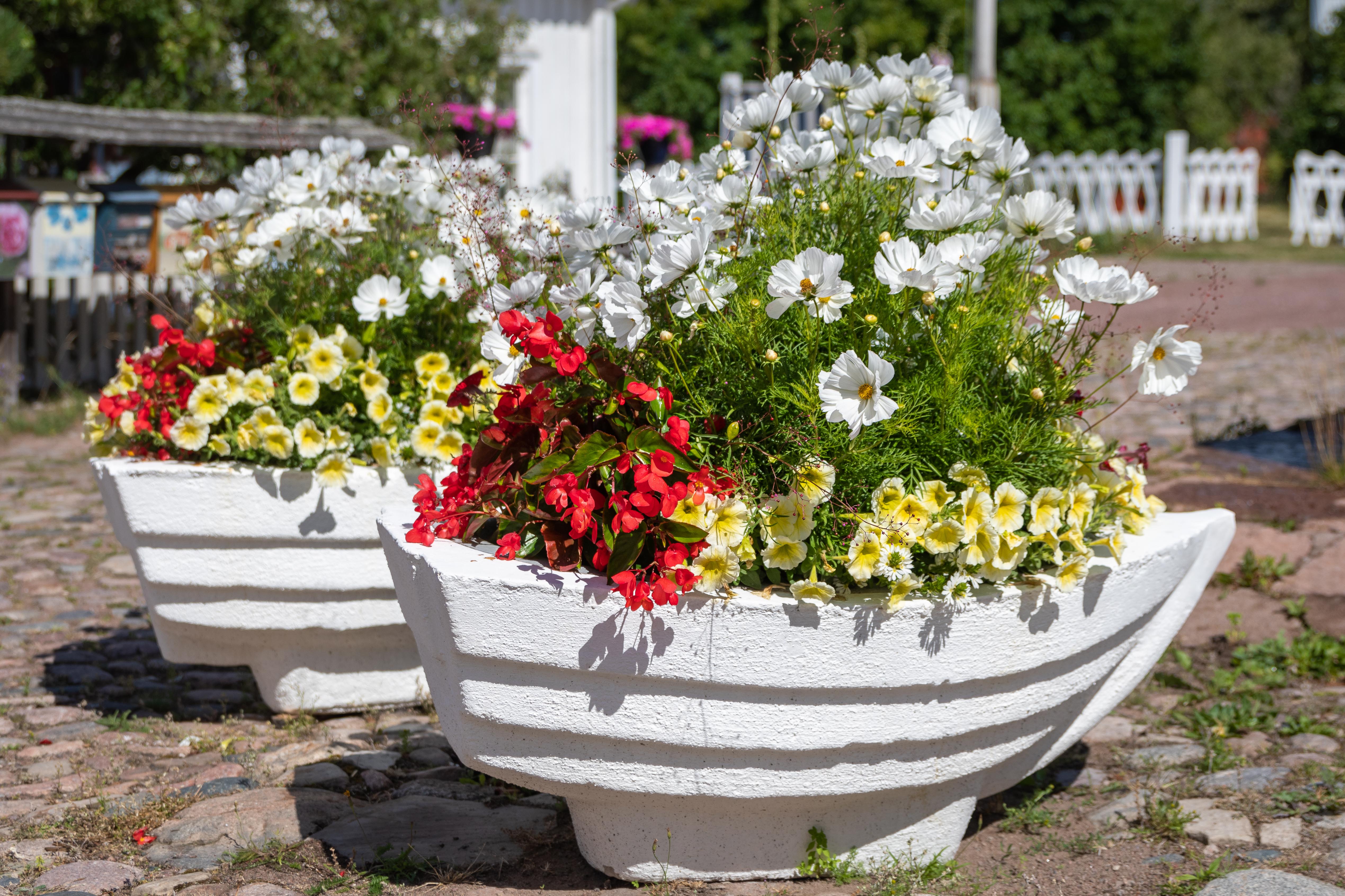 Att de vita krukorna är formade som små båtar syns hur tydligt som helst och vackert är det verkligen med dessa alla blommor. En toppenbild till temat!