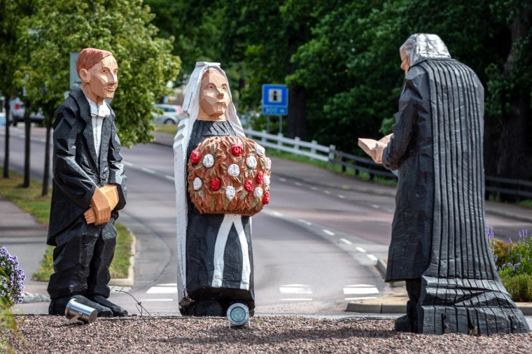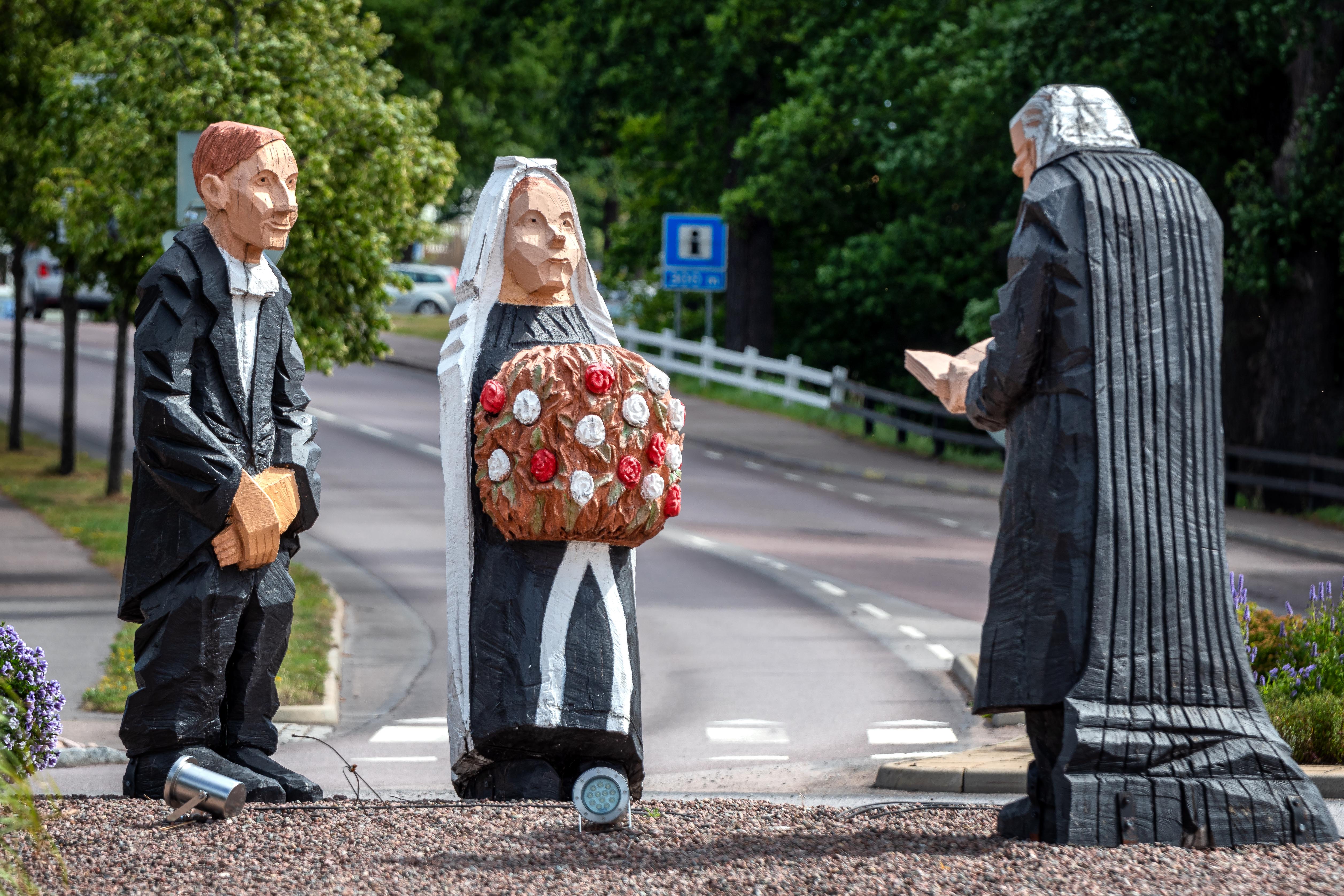 1. Jag kände inte på dem, men de såg ut att vara i trä. Stora som människor eller t o m lite större. De står i en rondell på infarten till Oskarshamn. De påminner om Döderhultarns (Axel Petersson 1868-1925) små snidade skulpturer och det är nog meningen. Han föddes i Döderhults socken utanför Oskarshamn.