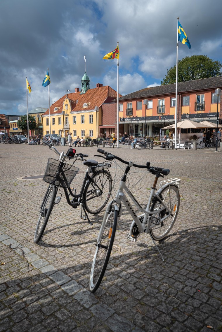Här faller blicken (min) först och främst på det vackra huset, de mörka molnen och flaggorna som vajar för vinden. Lite lustigt med tanke på att de båda cyklarna faktiskt tar ganska så stor plats. 🙂 Perfekt till temat!