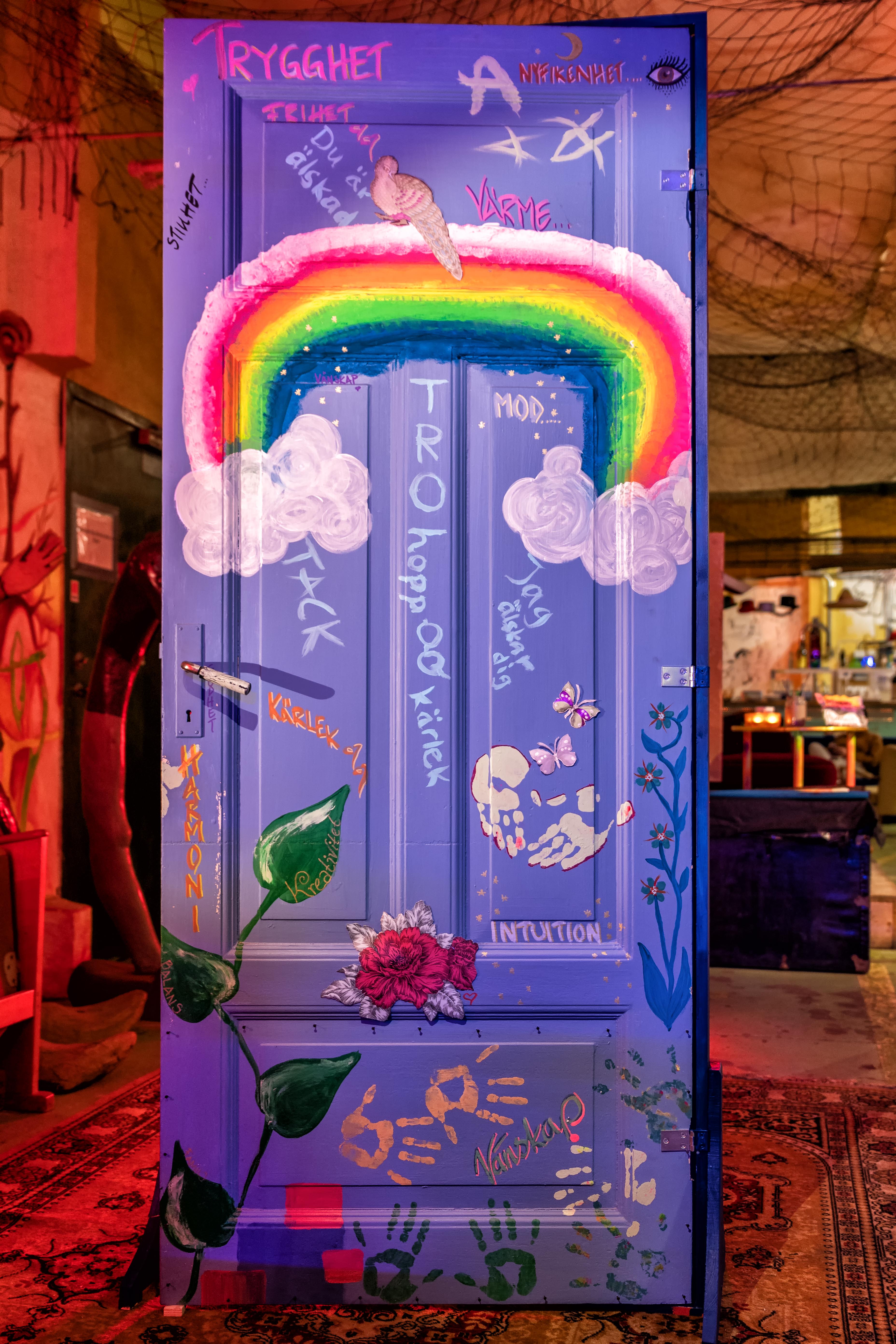 Tycker dörren känns lite rörig, fantasifull med mycket färg. Kan ses som välkommnade då den ju har flera positiva budskap. Skulle jag mötas av den dörren skulle jag nog stanna till och vänta ett tag, vill ju titta på alla detaljer. Blir inte klok på om den är fristående, det syns ju inga väggar och det är lite svårt att se vad som döljer sig därbakom. Onekligen en intressant dörr 😀