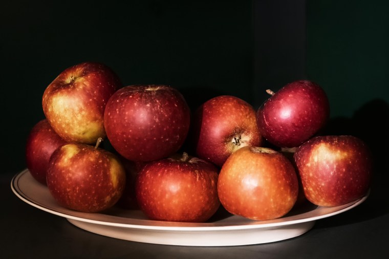 Skickligt att få den svarta bakgrunden att smälta in så snyggt bland äpplen, skuggor och fat. En väldigt lyckad bild.