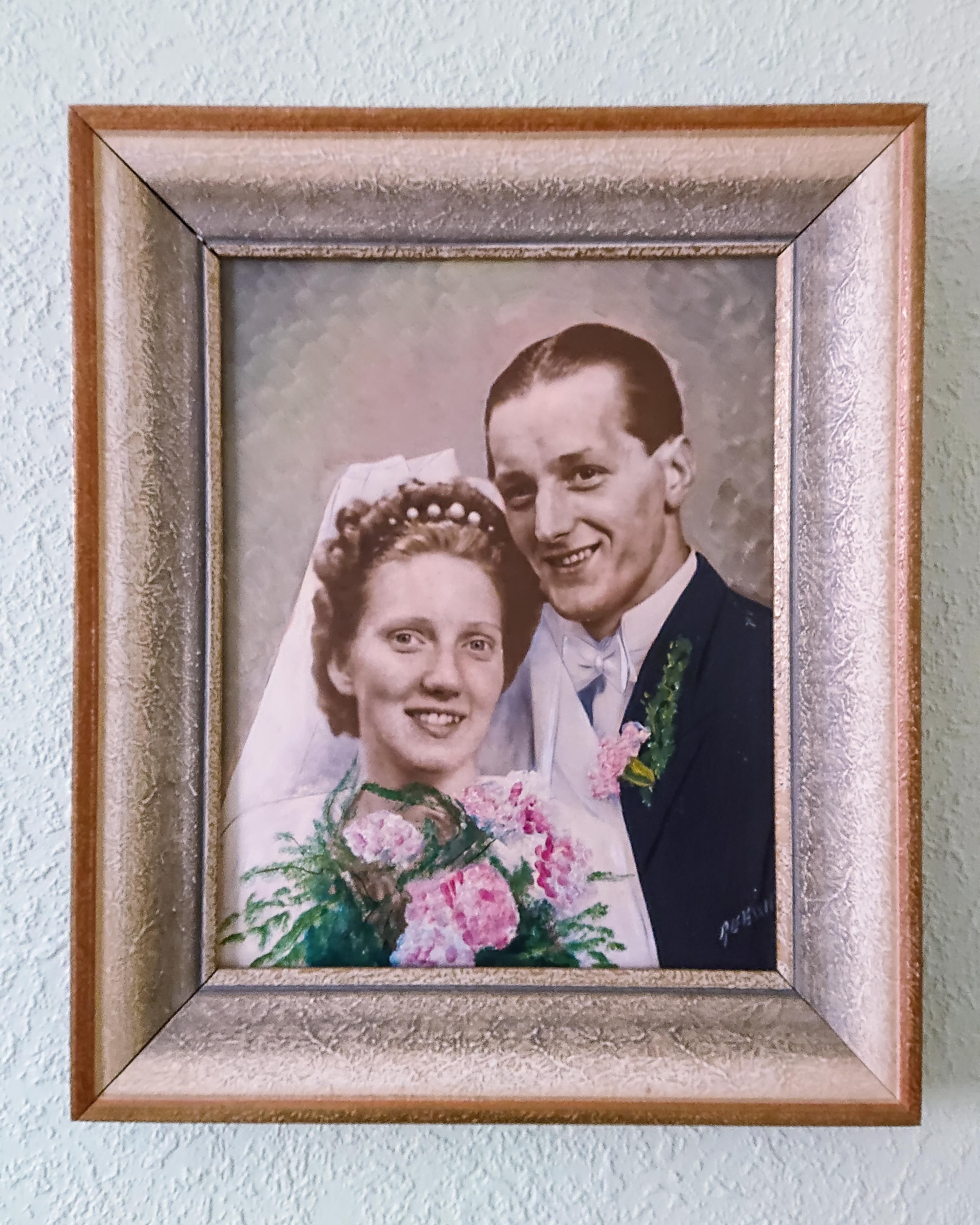 I fredags var jag och hälsade på min mor och syster i Karlskrona. Passade på att ta den här mobilbilden på mina föräldrars bröllopsbild. Min mor fyller 95 i februari 2021. Min far dog för 25 år sedan, men skulle annars ha fyllt 100 nästa år. Jag blir inte riktigt klok på tavlan för det ser ut som om det är ett foto, men där vissa delar, bland annat blommorna, är målade. Men det kanske var något man gjorde på den tiden.