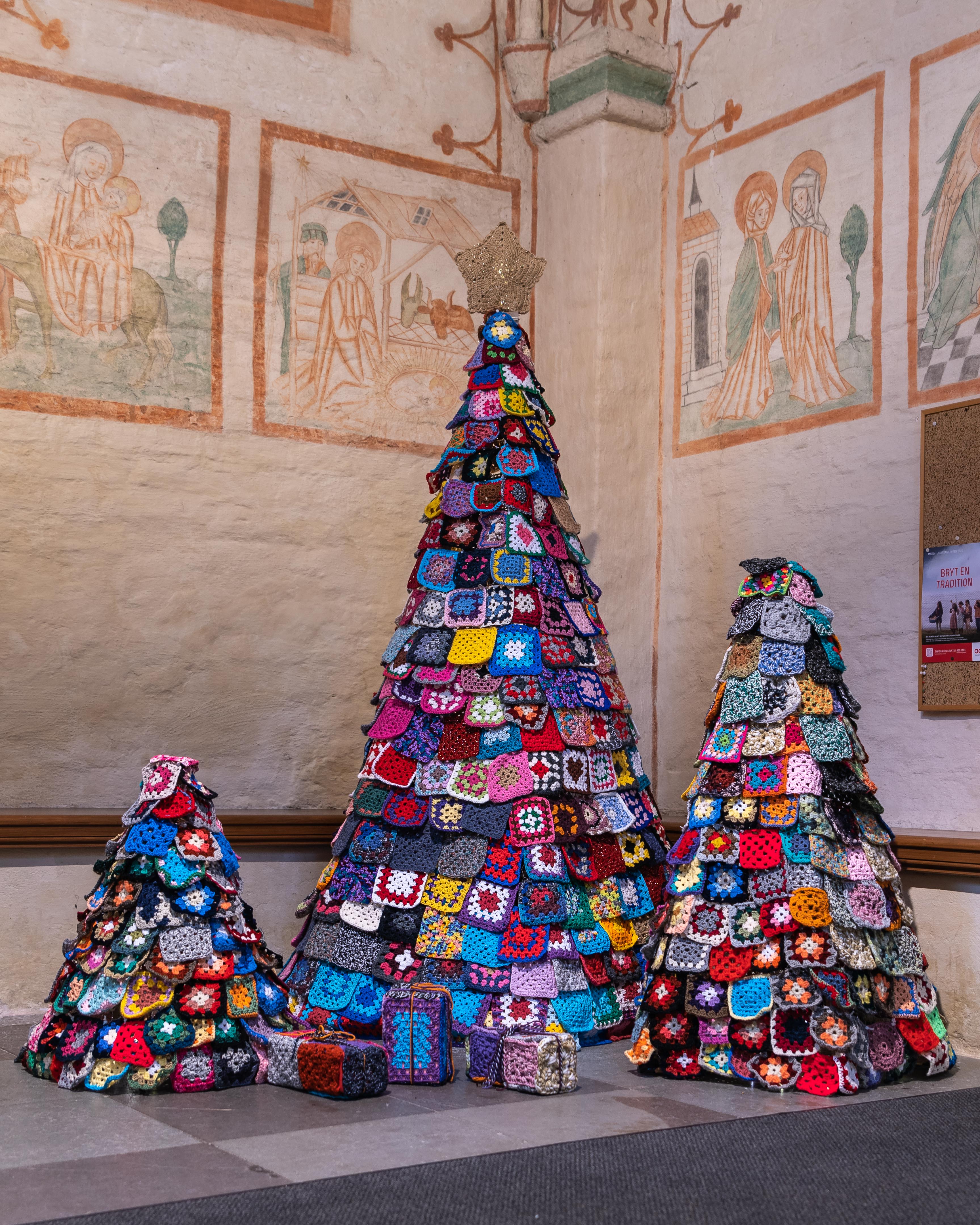1. Ahh, vad roligt!! Den här bilden fick mig verkligen glad! Förmodar att de står innanför porten till en kyrka? Underbara granar och paket! En och annan mormorsruta har man virkat, men inget så stort. En kompis till mig virkade en filt av sytråd..! Barbiestorlek. Love it.