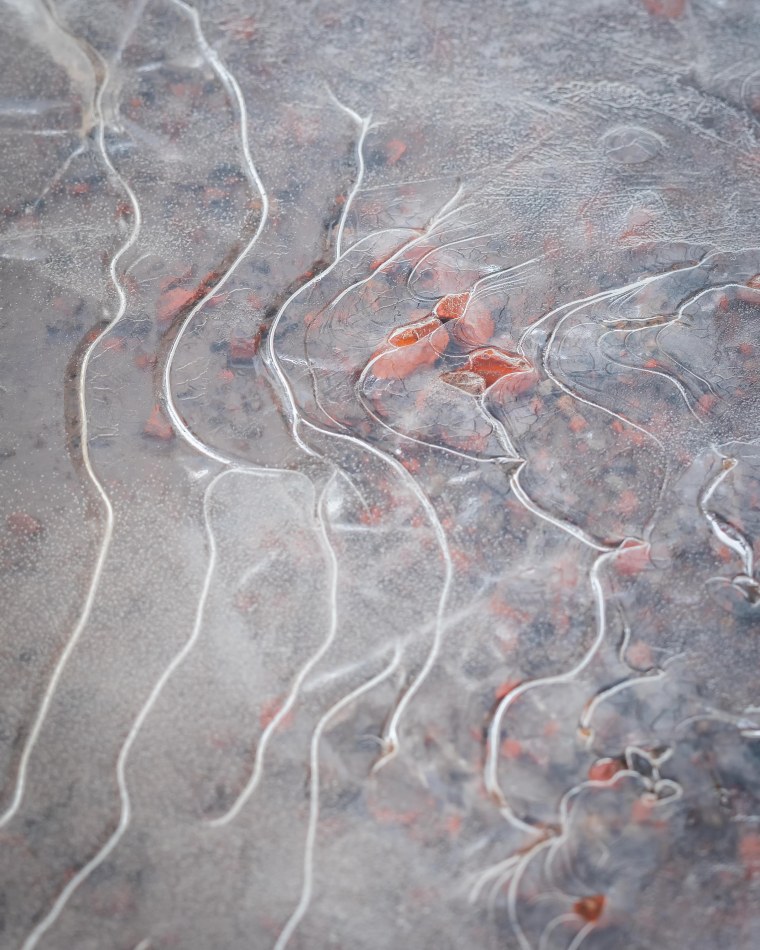 1. Isobarer i frostad is så att man bara anar vad som döljs under. De rödaktiga stenarna blir pastellfärgade och fullbordar naturens iskonstverk. Snyggt foto!