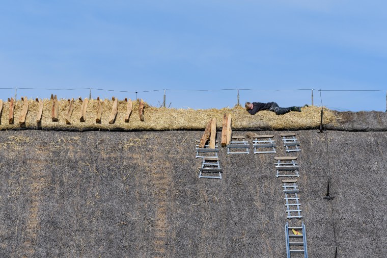 2. Ojoj….! Jag skulle inte vilja vara i hans kläder ! Det ser allt jobbigt ut med att lägga tak och att komma upp dit och sedan ner, brrr……fint fångat på temat !