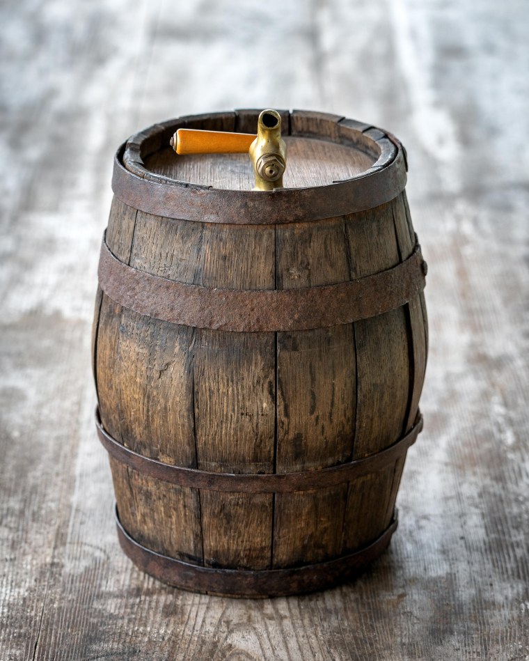 Fin ren bild med en lugn bakgrund och fokus på tunnan. Fint ljus och färg. Gillar det slitna trägolvet. Svara