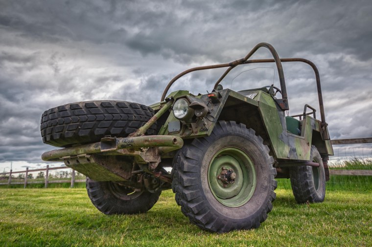 En gammal ful militärbil blir snygg på bild med de molnen som bakgrund och fotat i snygg vinkel.