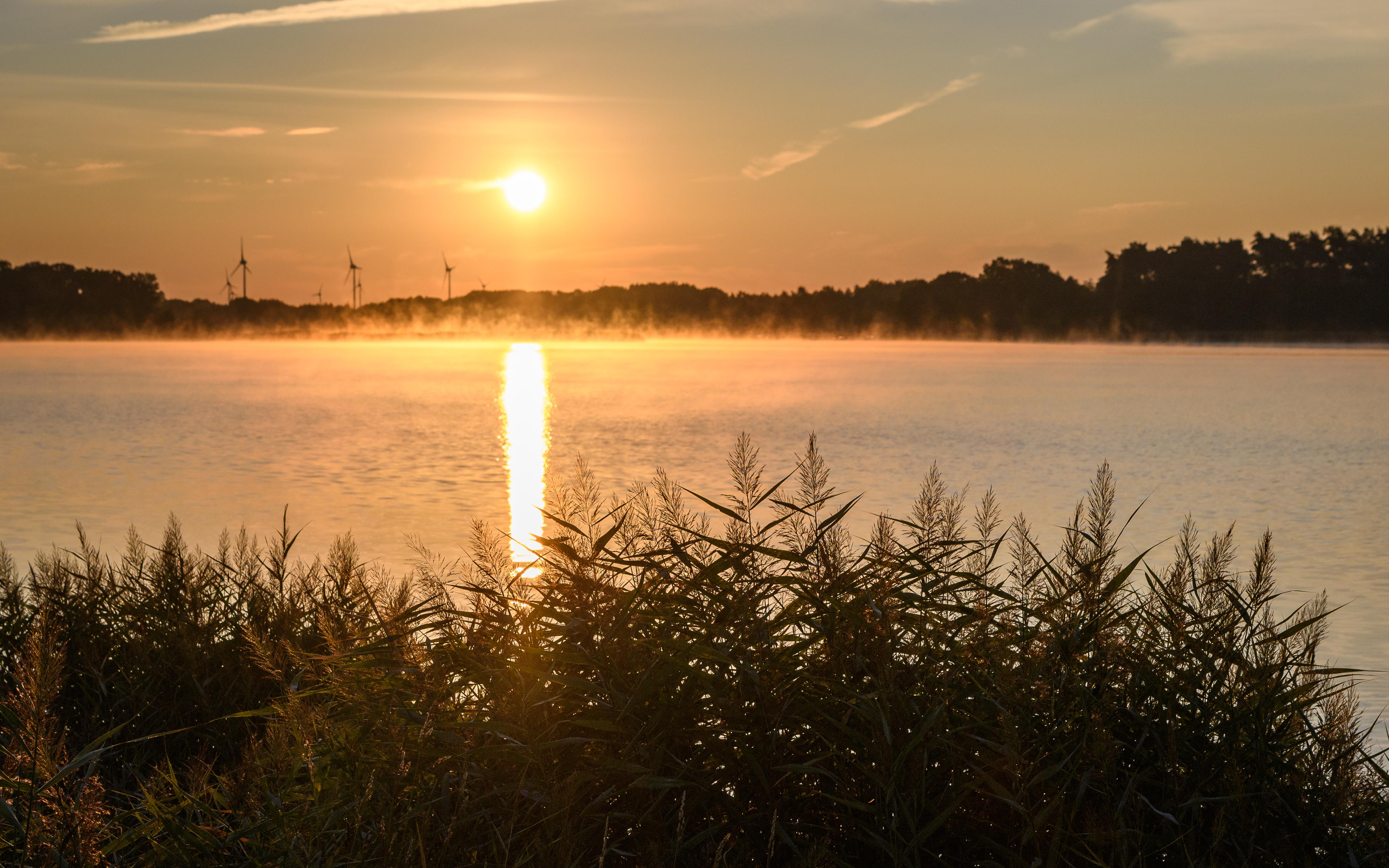 Vacker soluppgång med en trolsk känsla för att dimman ligger över vattnet, trevlig komponerad bild. Svara