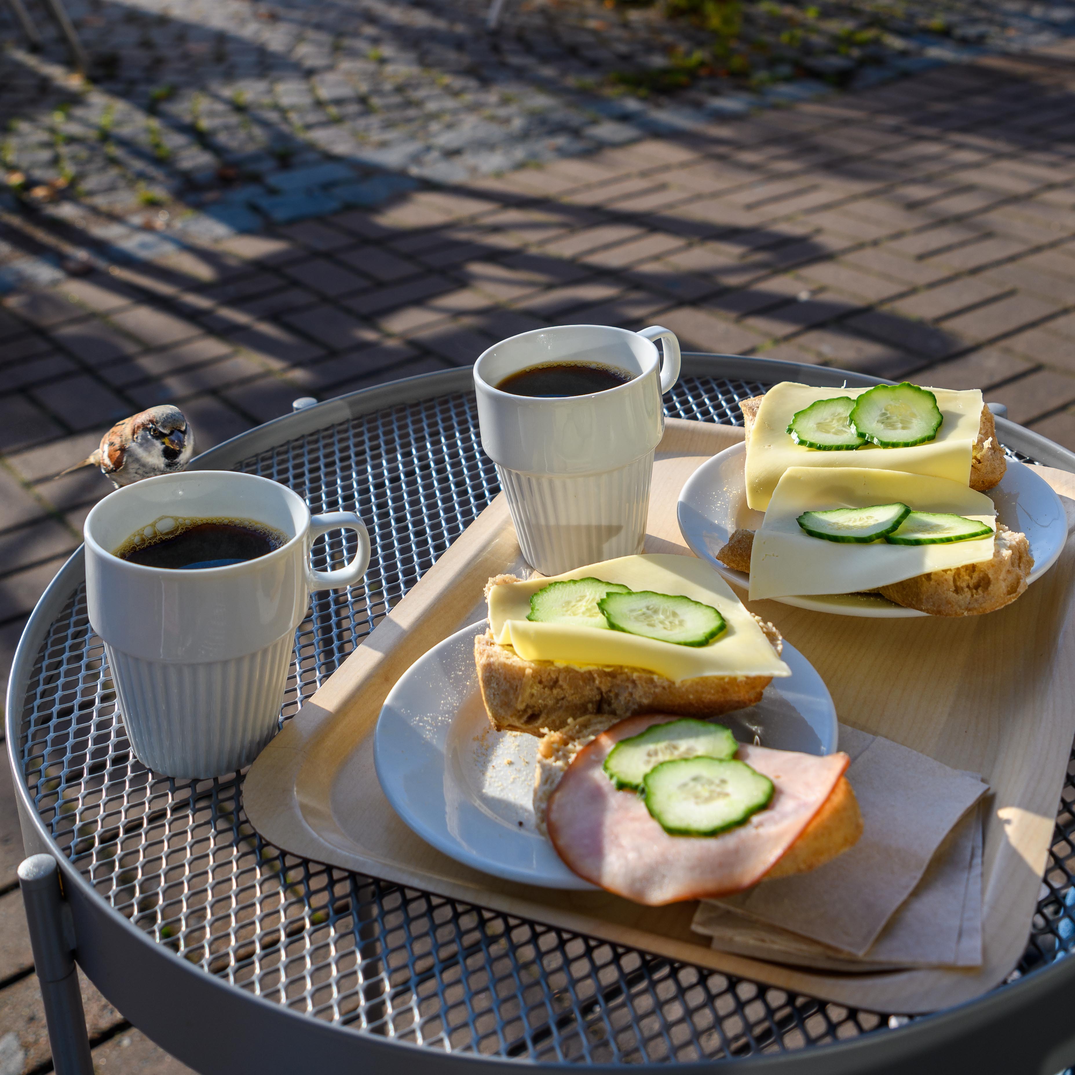 Det var inte bara vi som tyckte att det skulle bli mycket gott med en utefika i solen. Det dök upp, eller snarare ner, en liten gäst på bordskanten, som också ville vara med 🙂