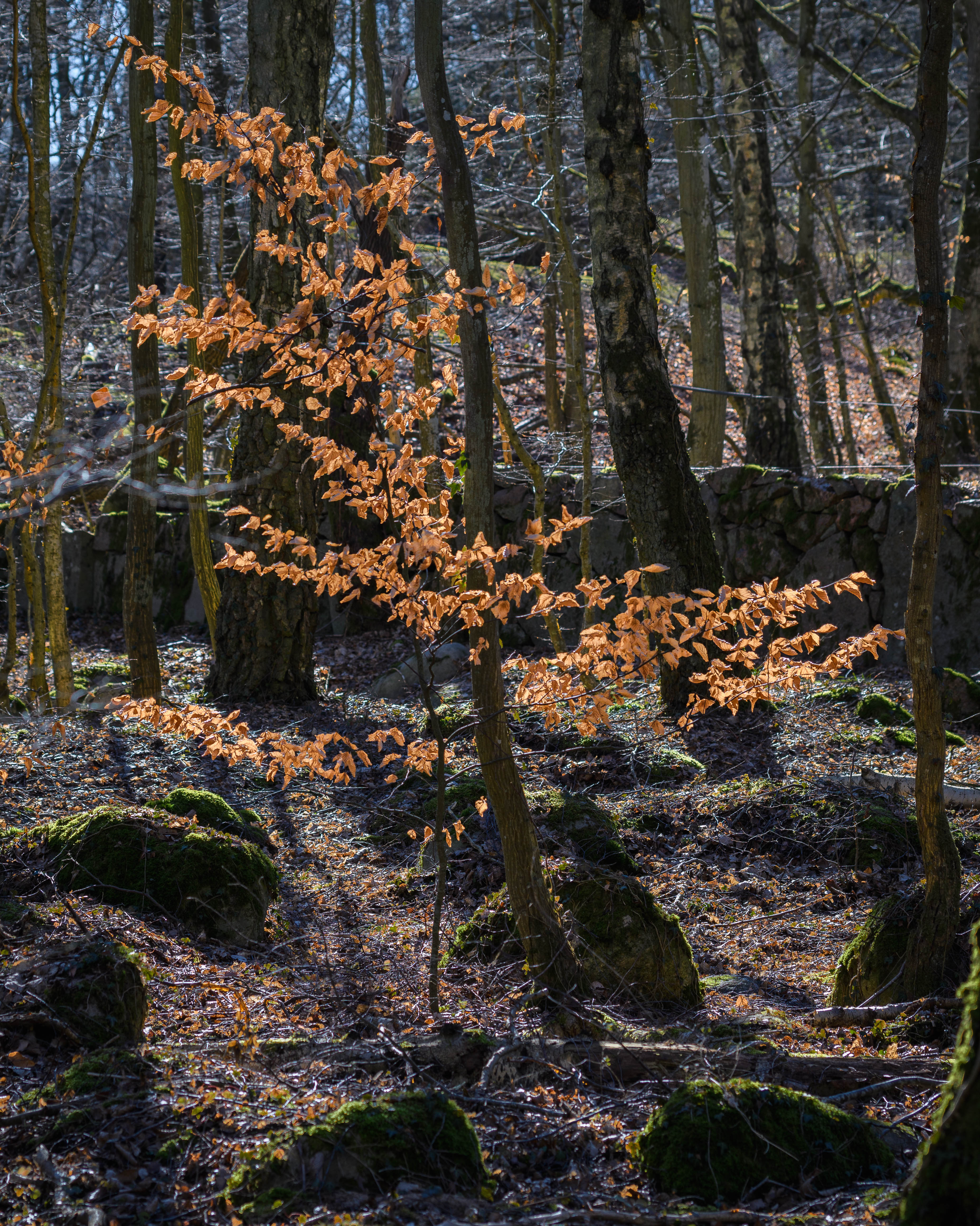 Jag hade solen rätt emot, som lyste upp löven från baksidan så att de syntes lång väg i det annars lite dämpade ljuset i skogen.