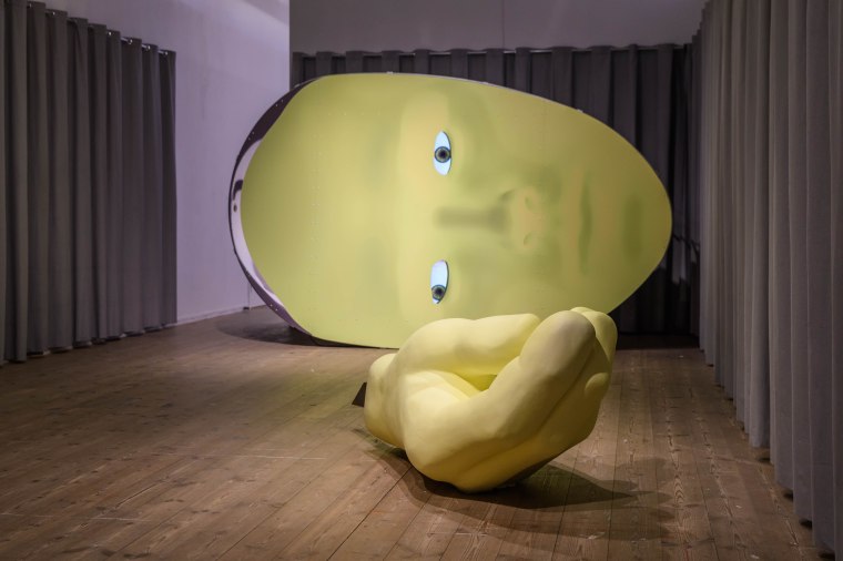 Annorlunda konst, jag måste kolla upp konstnärerna. Det slår mig att stora, lite uttryckslösa ansikten är inne i konsten, jag kom att tänka på det ishuvud som jag fotade på ishotellet 2017. Men när jag kollade nu så är det faktiskt lite mer uttrycksfullt än det här som egentligen är som en mask. Snyggt foto.