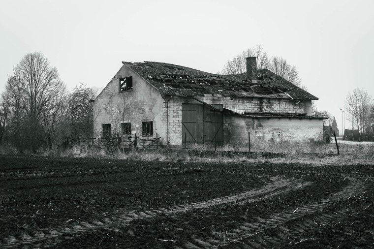 2. Gissar att det inte är en slump att traktorspåren ligger i förgrunden. Skitsnyggt ville jag säga och valde att behålla det i tryck. Hellyckat foto på förfallen byggnad.