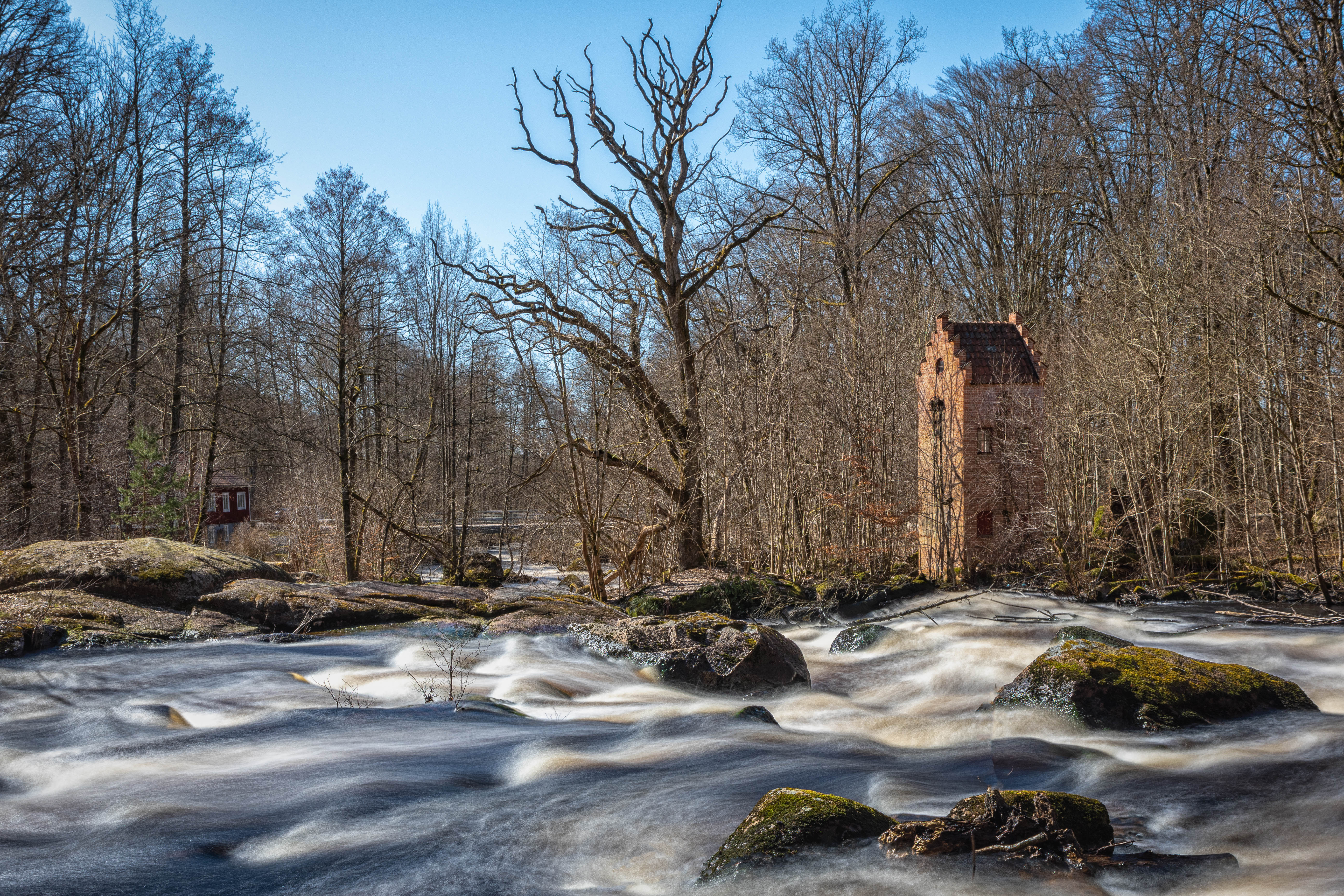 Mycket vatten är det och vacker natur, fint med tornet, allt snyggt och uttänkt fotograferat. Även vattnet tilltalar med de mossiga stenarna och flödet – trots att jag annars inte tycker om när man ”slätar ut” vattnets kraft.