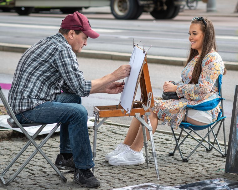 Den ena helt koncentrerad och den andra förväntansfull. Hoppas att förlagan inte blir besviken på avbildningen. Lite genant att hon sitter där med klänningen upphakad i stolen. Snyggt och bra gatufoto. Svara