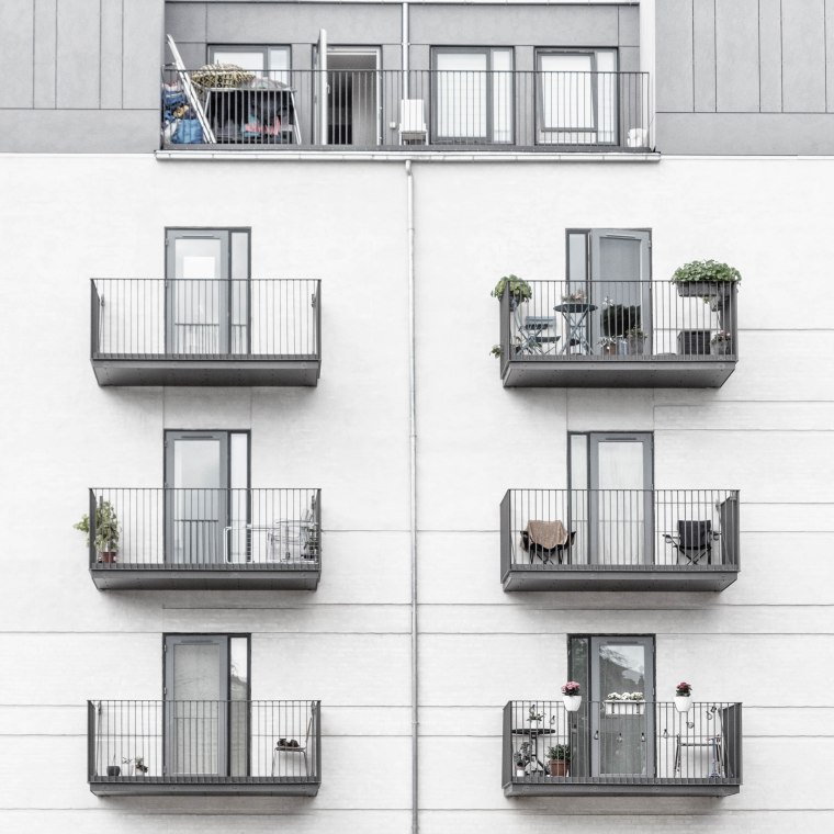 1. Snygg symmetri och minimalism. Lockar till att kolla nära. Alla andra använder sin balkong, utom den översta till vänster. Men den har en lapp på fönstret, kanske är det nåt fel på balkongen och den varnar för det. Och så den långa överst, mycket bråte där.