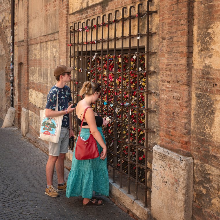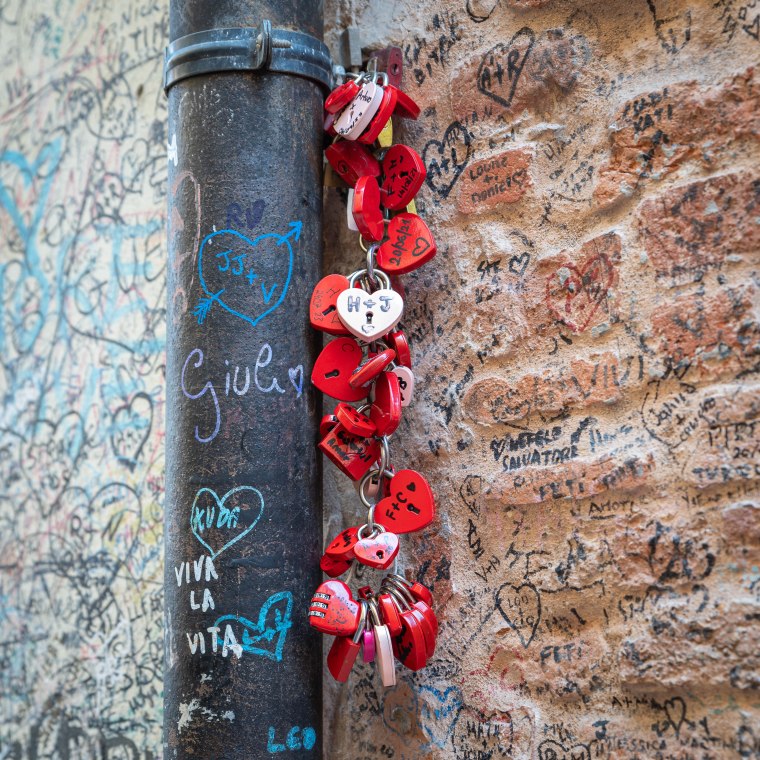 Det var riktigt varmt den där dagen, 38 grader i luften. Man såg många som svalkade sig med solfjädrar. Stupröret var vid Julias hus (i Shakespeares Romeo och Julia). Skulle tro att låsen var avsedda för detta. Tack 🙂
