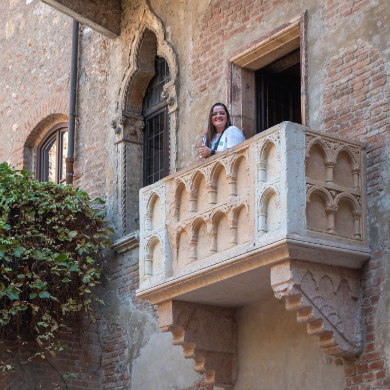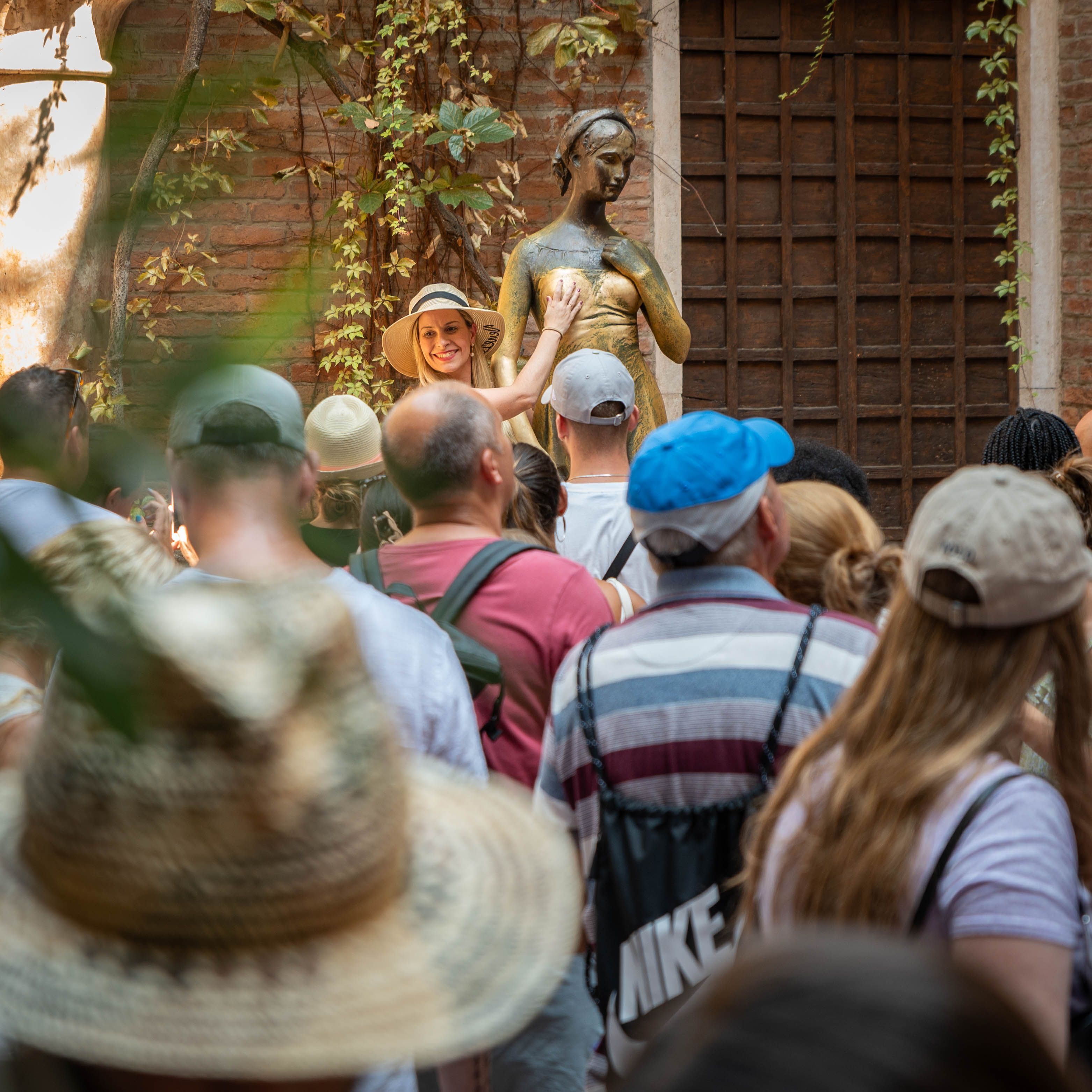 Här trängs nyfikna turister för att se statyn av Julia och det som sägs vara Julias balkong (i Shakespeares ”Julia och Romeo”). Det sägs också att man får lycka i kärlek om man stryker över hennes högra bröst 🙂