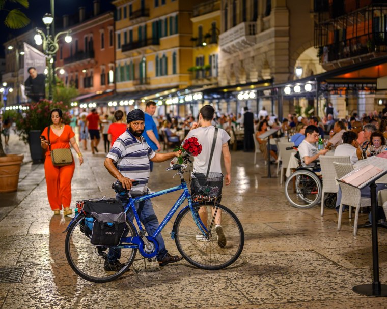 1. Rosenbukett som han ska uppvakta någon med. Men han ser sammanbiten ut, kanske vill han inte bli fotad. Snyggt med den blå cykeln, den röda buketten gör sig bra mot den.