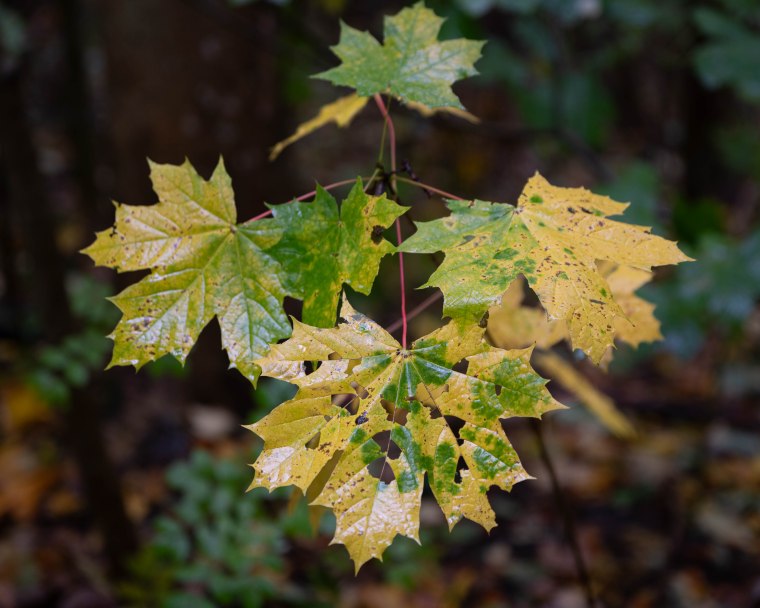 Och någon har festat på det nedre. Höstlövfest är det nu, gröngult är en av nyanserna i höstmodet.