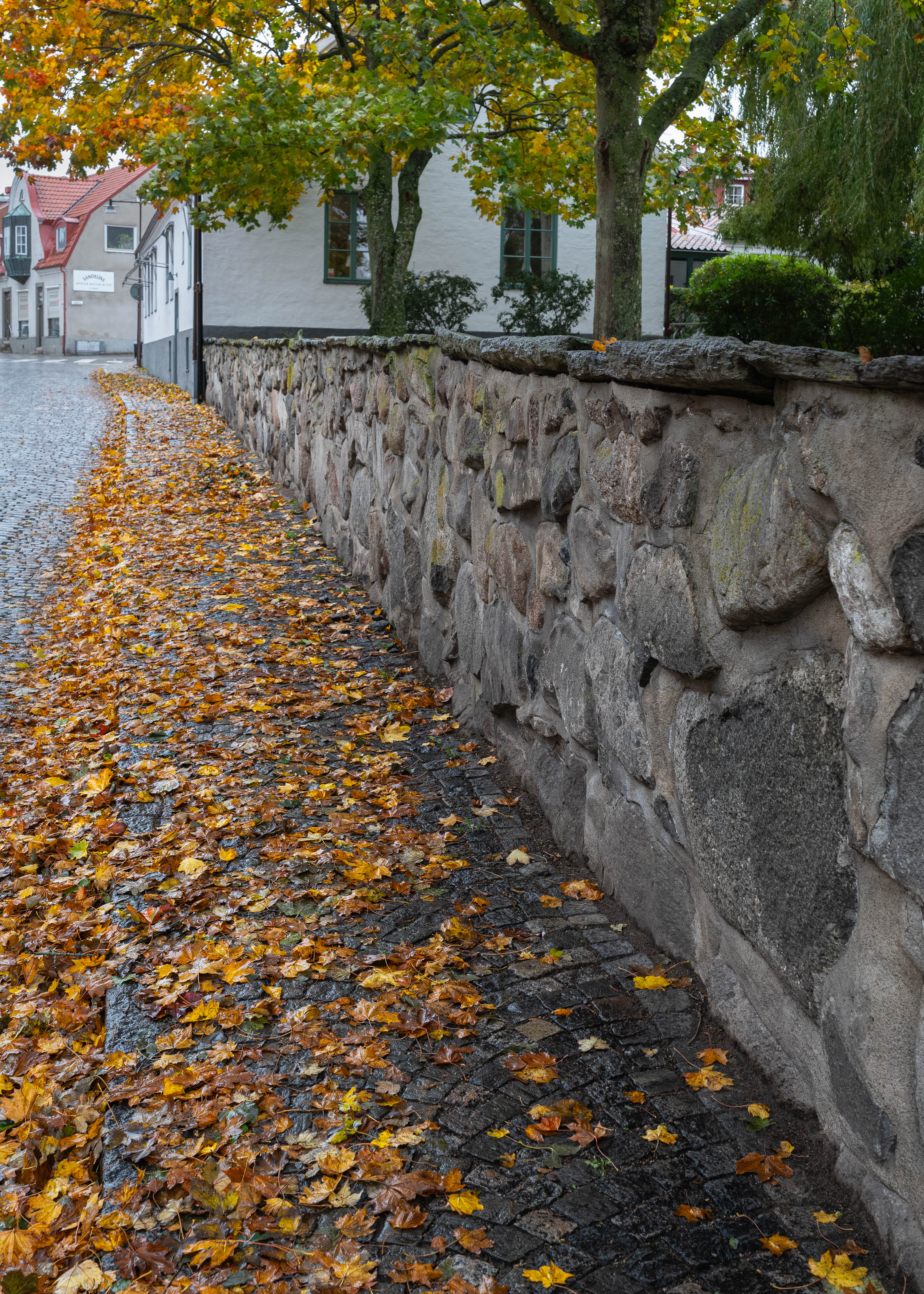 Är det muren som är kantsten? Eller är det kantstenen under löven? Så fint med hela trottoaren höstdekorerad, men lite halt kan det förstås vara. Vackert perspektiv med den lååånga lövtrottoaren.