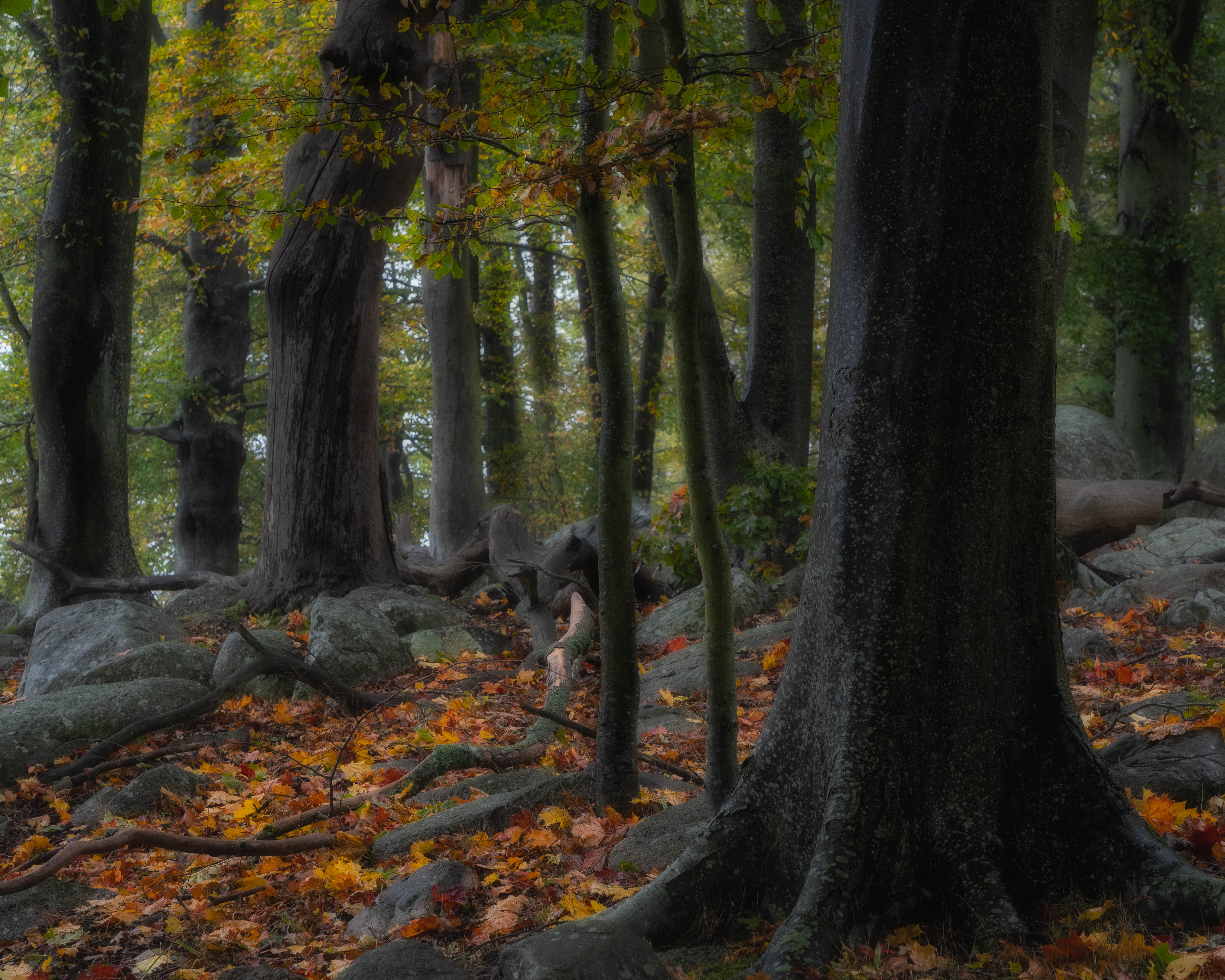 Lätt hänt. Lurigt med den avskalade genbiten på marken, jag trodde att det var en arm som stack fram där, ett mörkt väsen som böjde sig framåt. Sagoskog, trolsk och spännande bild.