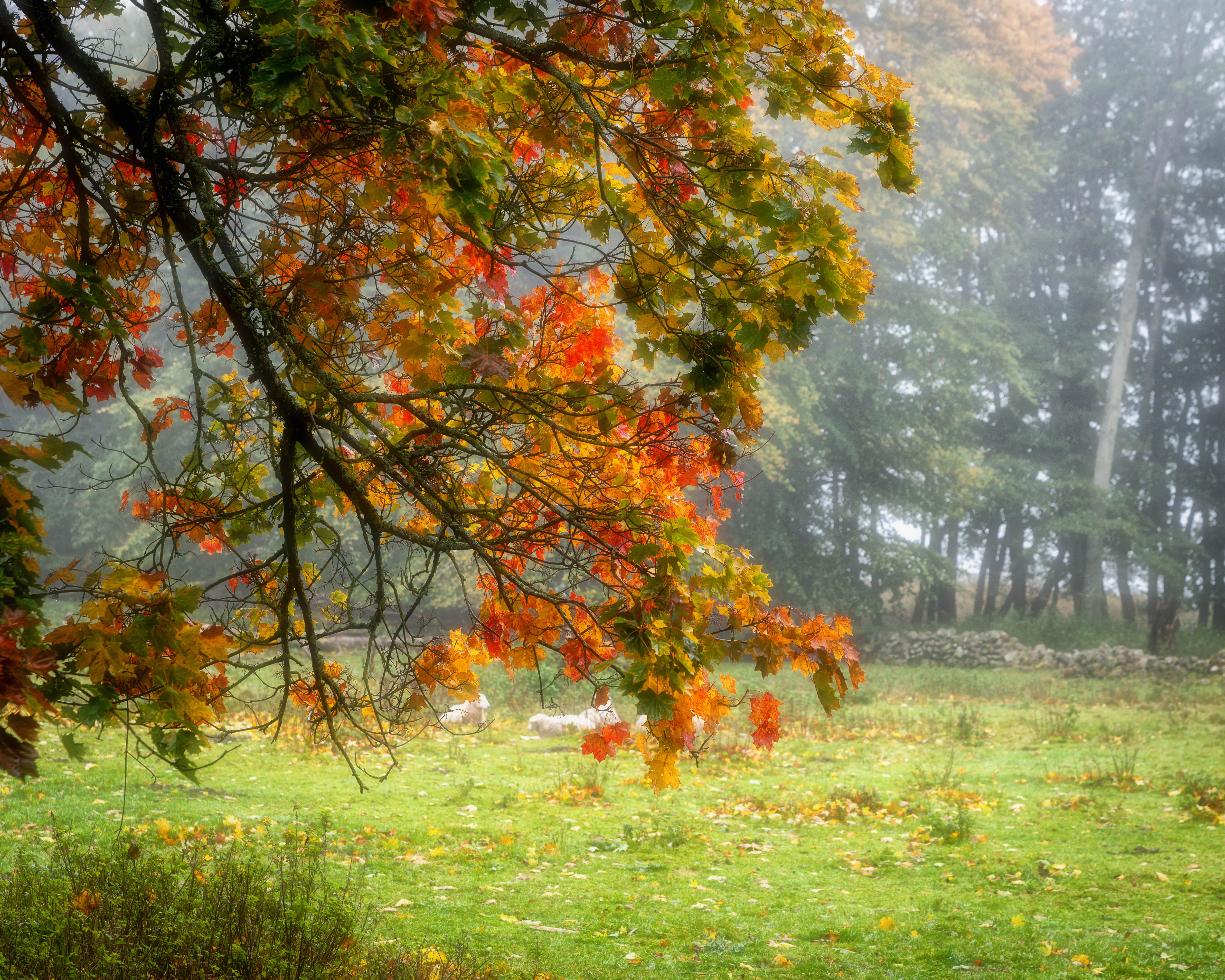 Där finns det mesta, lönnarna kan de! Och är det vilande får i bakgrunden? Så vackert med grenens höstjubel och dimman.