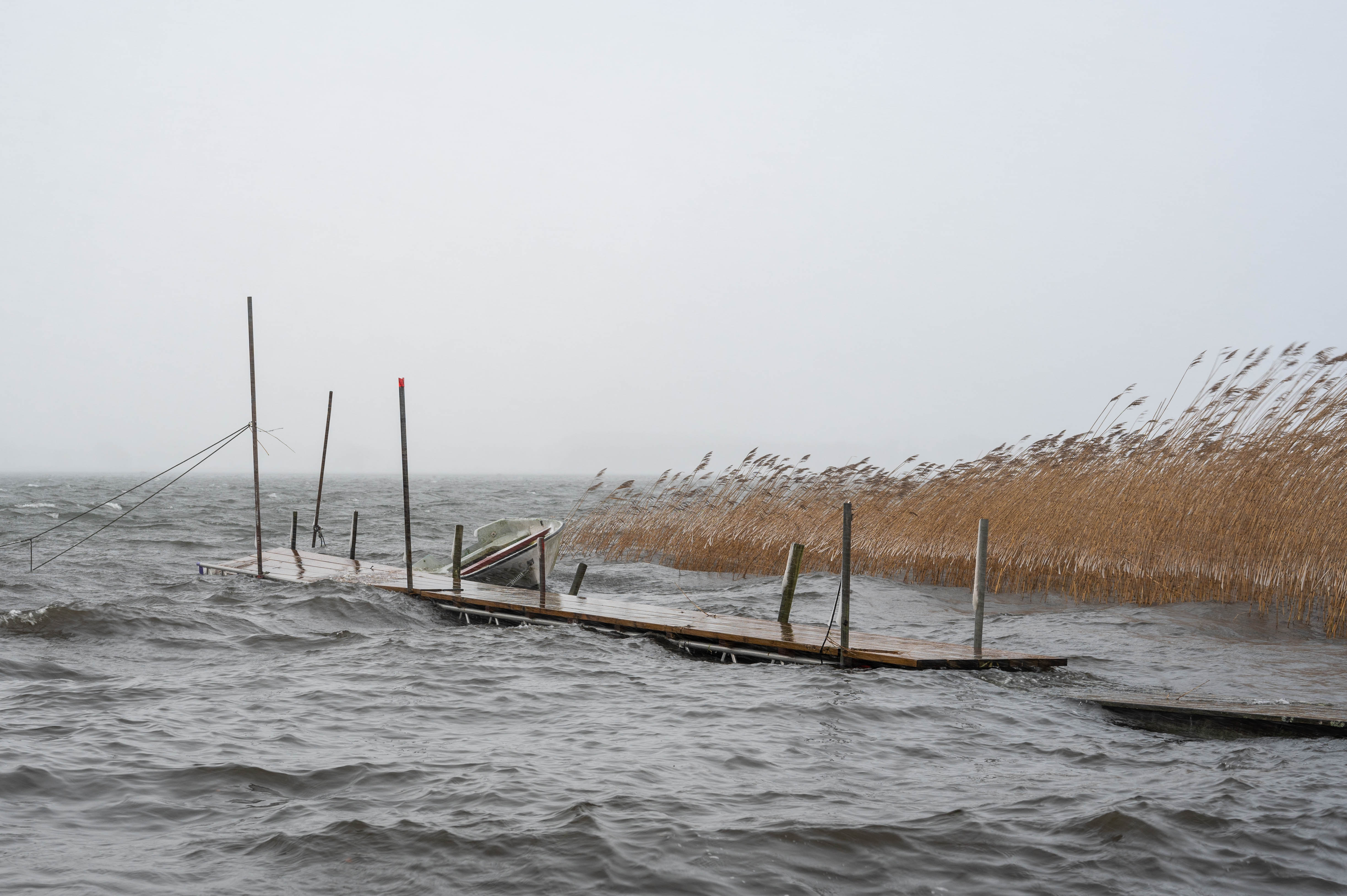 3. Ojojoj, här susar det verkligen i säven! Häftigt och jätteläckert foto med bryggan som nästan flyter iväg, vågen som tar vägen över den och båten som sliter i förtöjningen och nästan har kantrat.