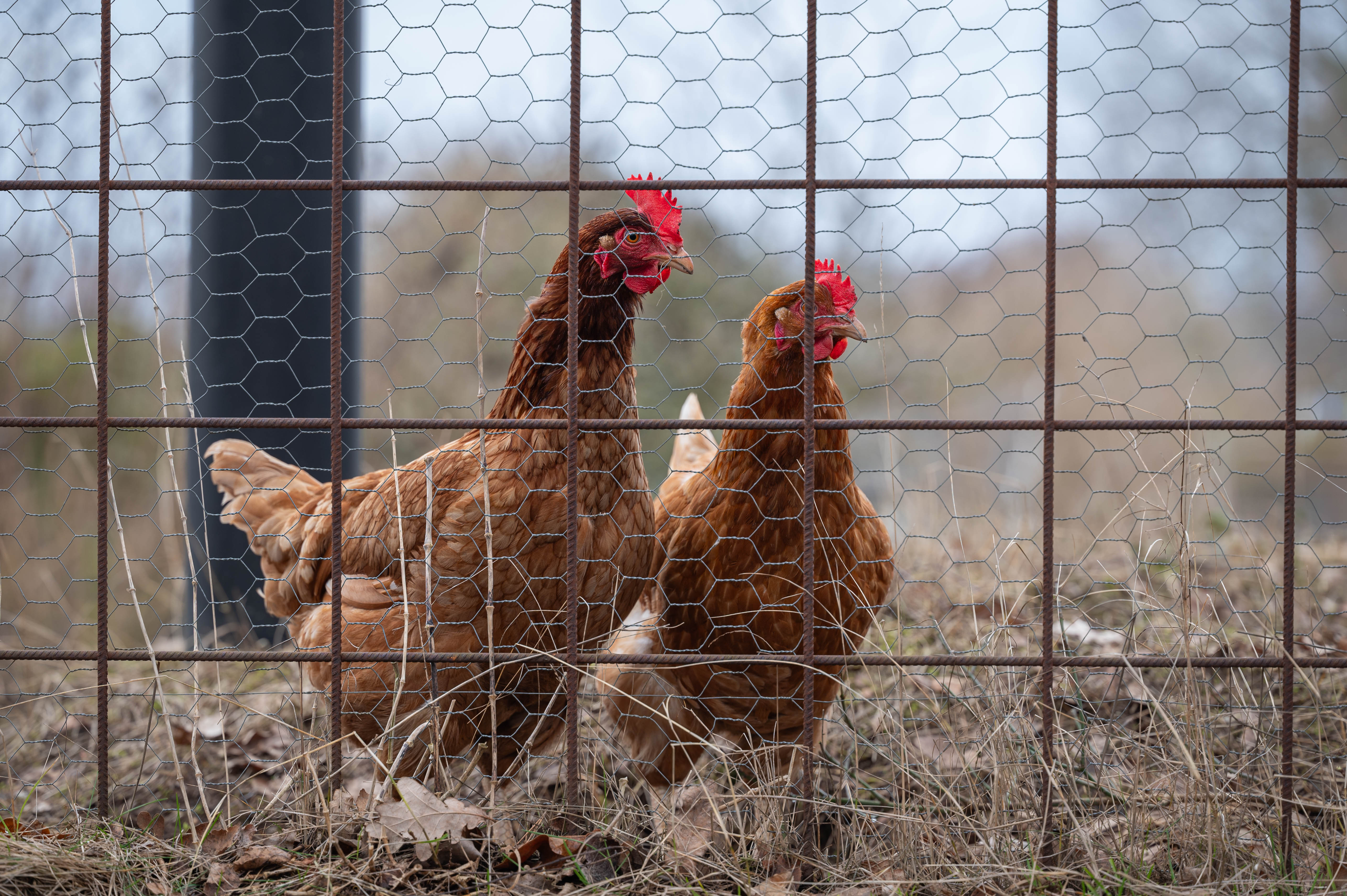 Ståtligt tupp-par, snygga kammar – ordentligt inburade. Det behövs nog, det är många som vill få sig ett skrovmål. Lite synd att armeringsnätet (som rutnätet i kameror eller i beskärningsverktyget!) hamnade mitt för ögat på den ene tuppen. Men på sätt och vis förstärker det inburningen.
