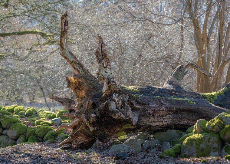 Har den lagt sig över en stenmur? Kul med stenen som sitter fast, men annars verkar det vara en gammal välta, roten är putsad och fin, Snyggt med de mossgröna stenarna mot den liggande trädskulpturen.