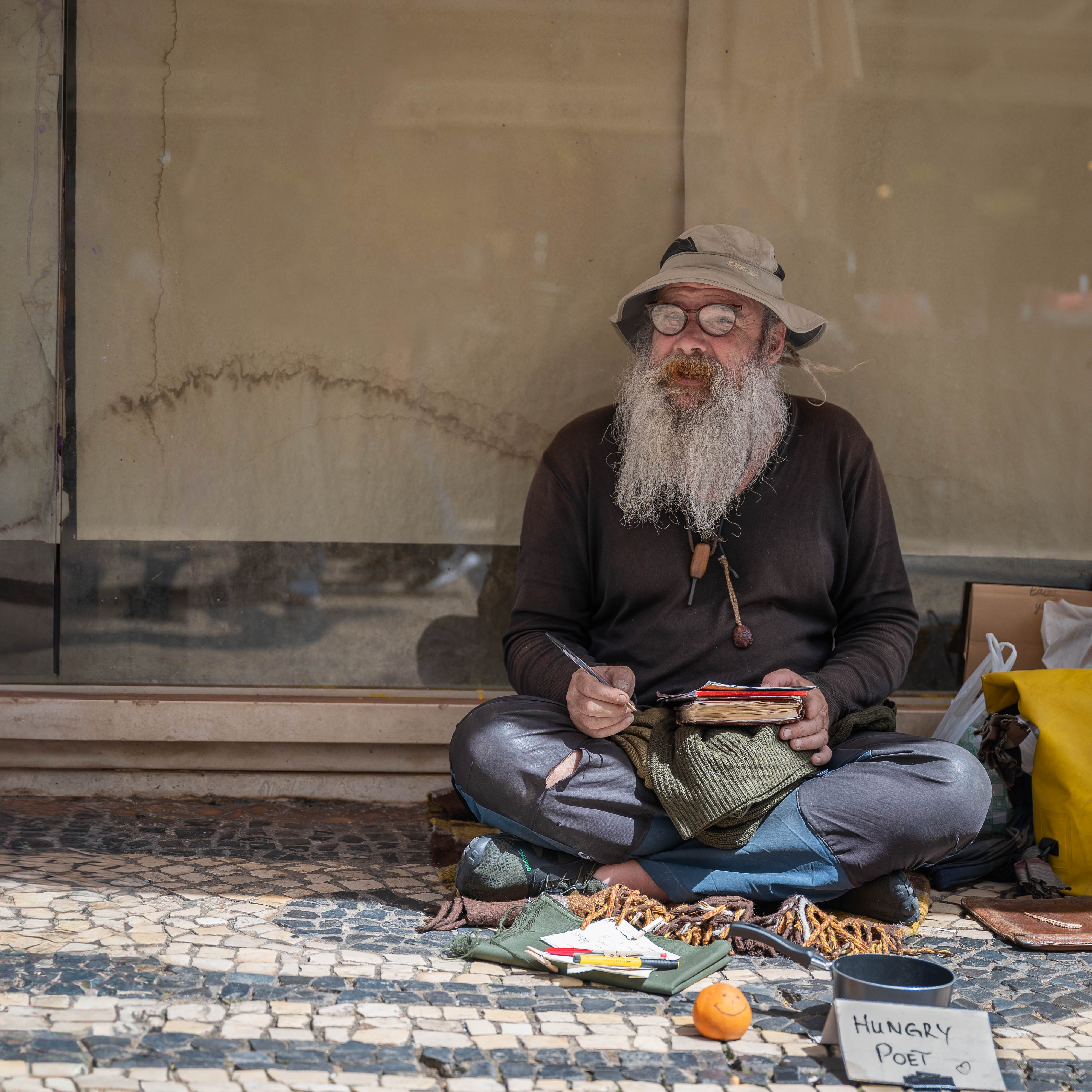 1. Tack 🙂 Det såg ut att ligga lappar med många uppslag till dikter i den där boken. Kanske blev han inspirerad av det som hände runt omkring honom. Jag tyckte hans skylt var lite kul. De flesta tiggare vi såg bad om pengar, antingen till sig själva eller till mat åt en medhavd hund. Men poeten här bara upplyste lite subtilt om att han var hungrig 🙂