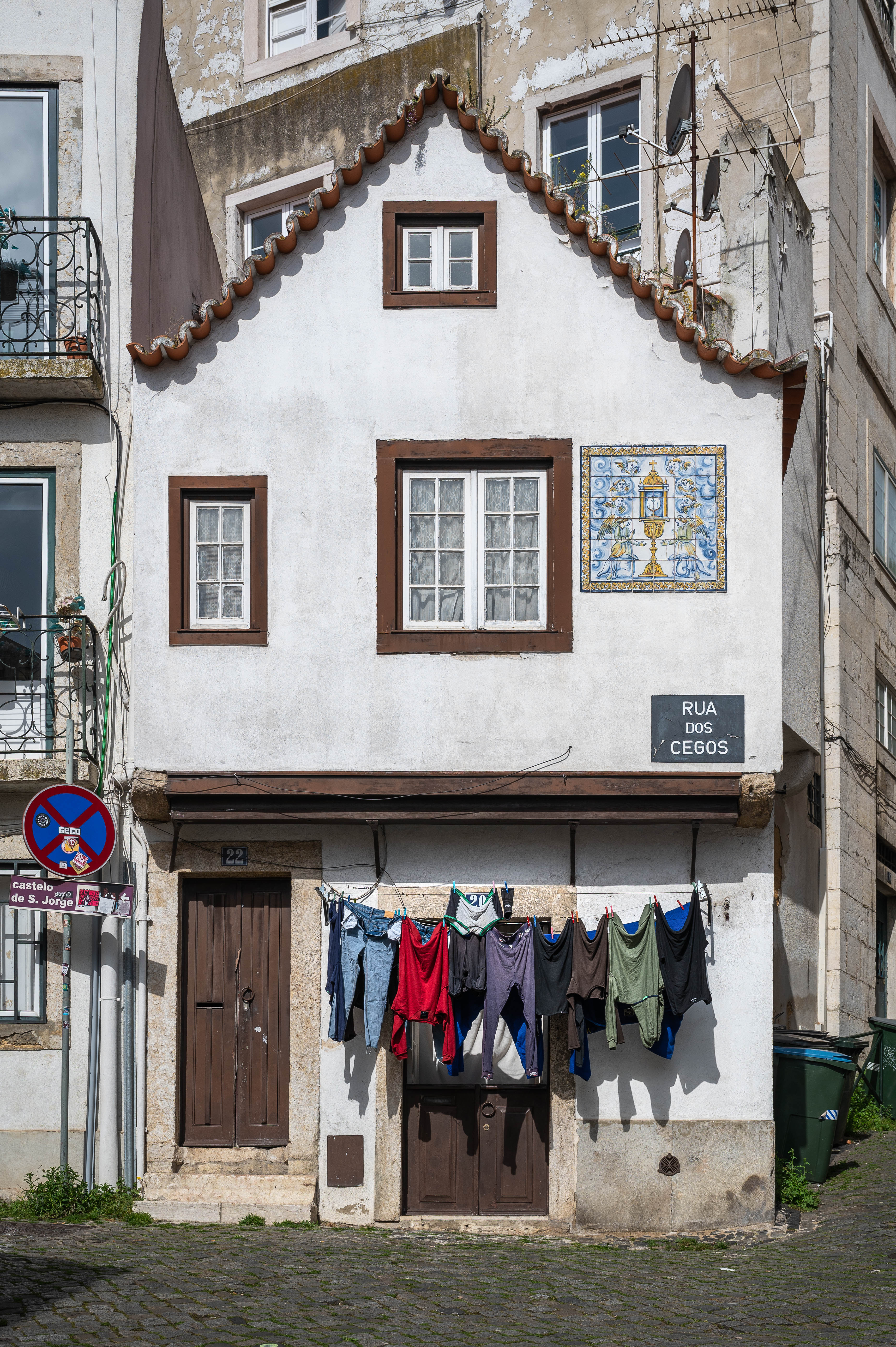 Huset ser pittoreskt ut, inklämt bland högre hus. Man har förmodligen inte tillgång till någon bakgård att hänga tvätten på. Det blir färggglada klickar i stadsbilden. Svara