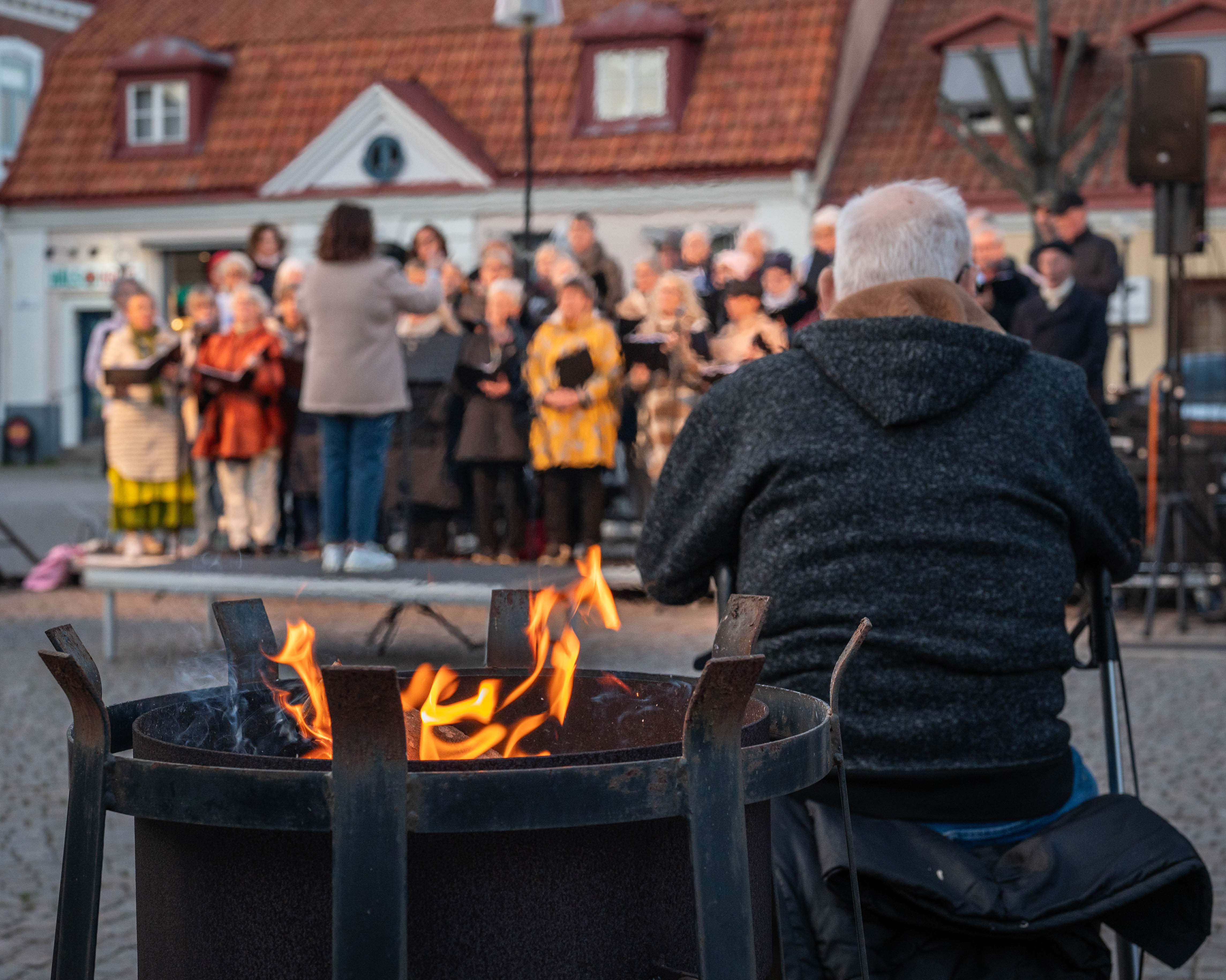 1. En liten majbrasa? Där sitter han bra när kören sjunger in våren. Klart att han måste vara på plats då. Fin stämning i bilden.