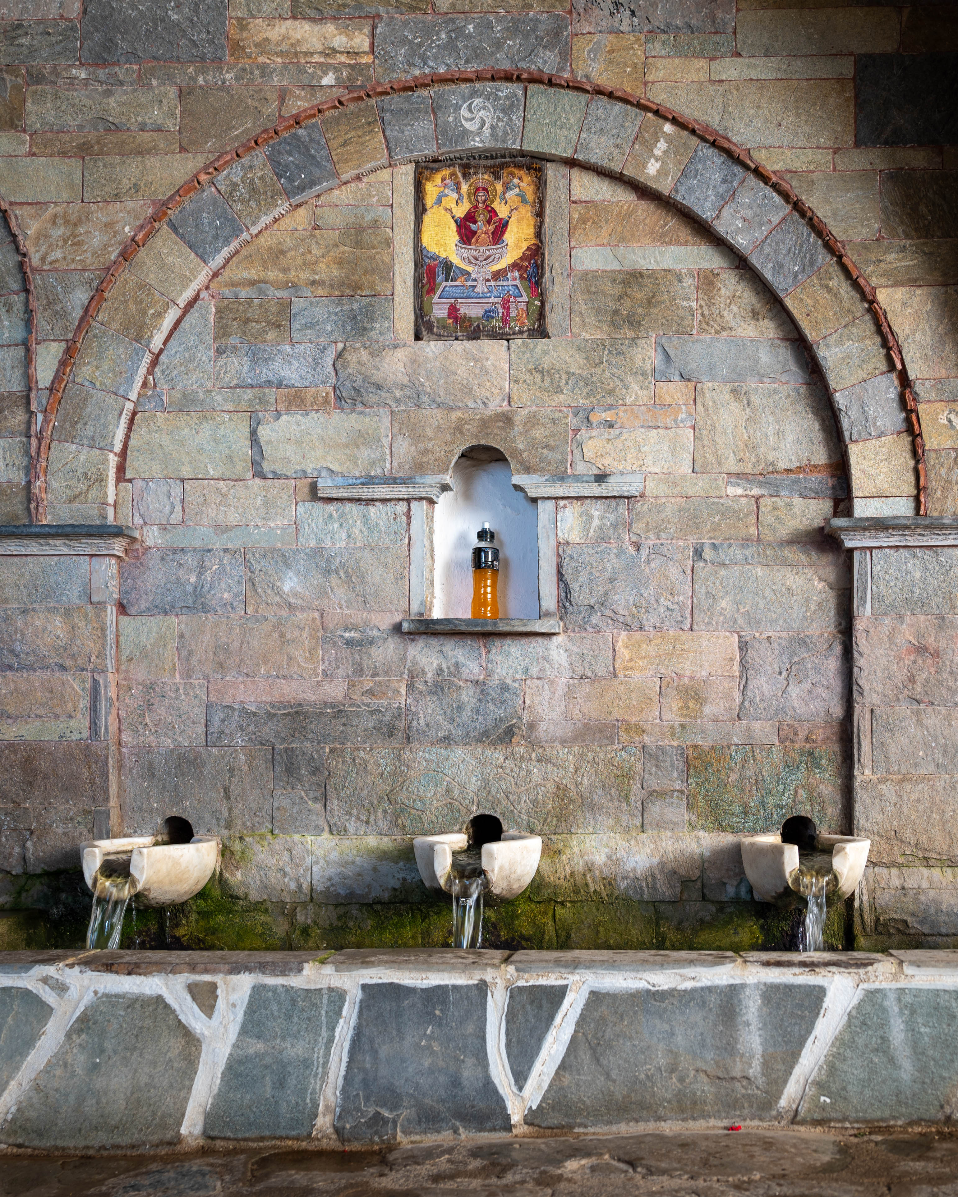 Jag vet inte vad det kan vara i flaskan, men platsen ligger i ett valv under en stor kyrka på Karpathos. I de grekiska kyrkorna står ofta flaskor med någon form av olja. Kanske kan det vara något sådant 🙂